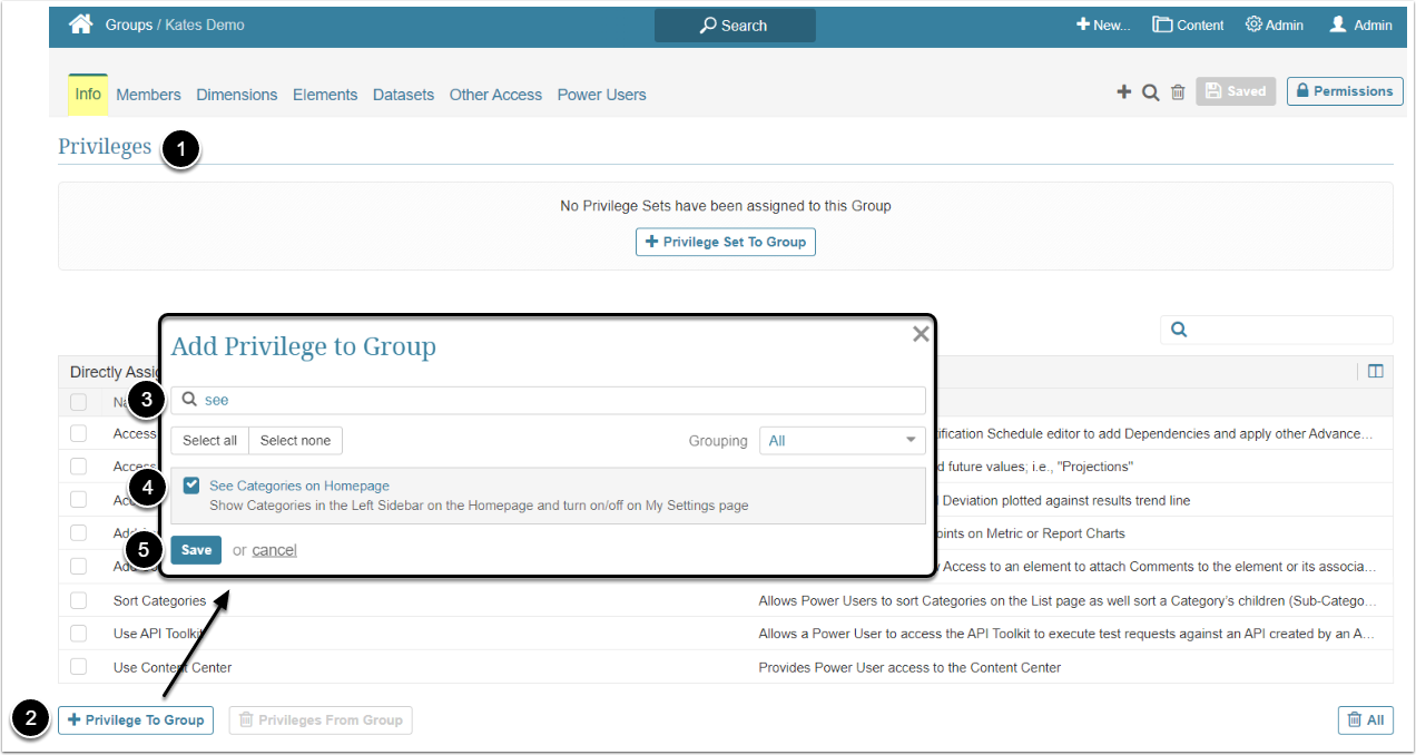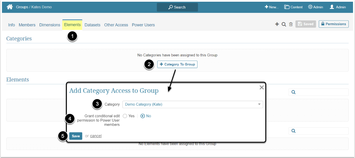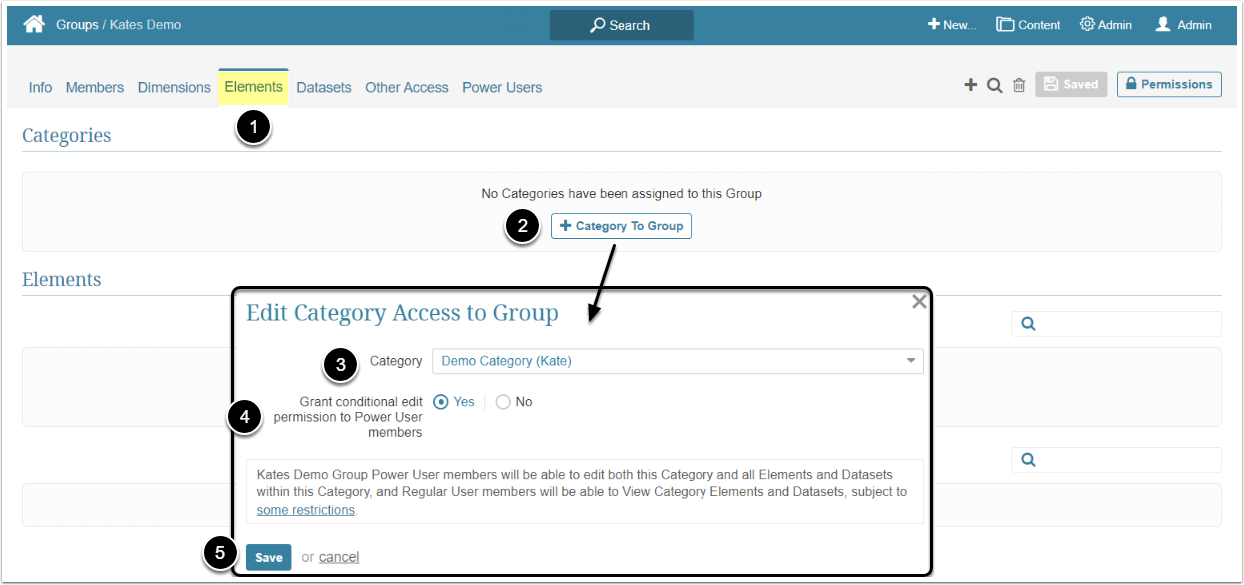NOTE: With this Permission, all Power User members of the Group receive Permission to Edit not only the Category, but all Elements and Datasets included in it. However, the PU's will not be able to edit the specific Element or Dataset unless they individually or the Group they are members of is granted at least View Access to the Element's Data Source and corresponding Privileges. For more information about granting access to the Elements, check the articles in this chapter.