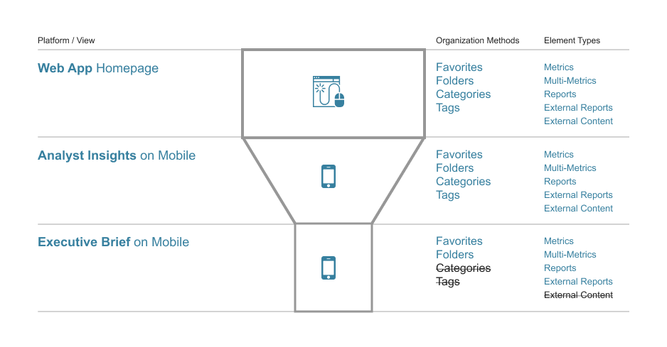 Both Mobile and Desktop have unique strengths. While desktop is suitable for a variety of tasks (searching, viewing, collaboration, building and editing), mobile is best for an isolated set, primarily viewing, collaboration, and basic searching. The details below should clarify any questions you might have about what is accessible in the various mobile views (Analyst Insights / Executive Brief)