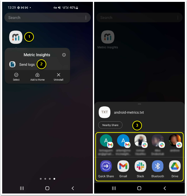 Logs can be sent to a specified email address via the Metric Insights app on Android/iOS devices.