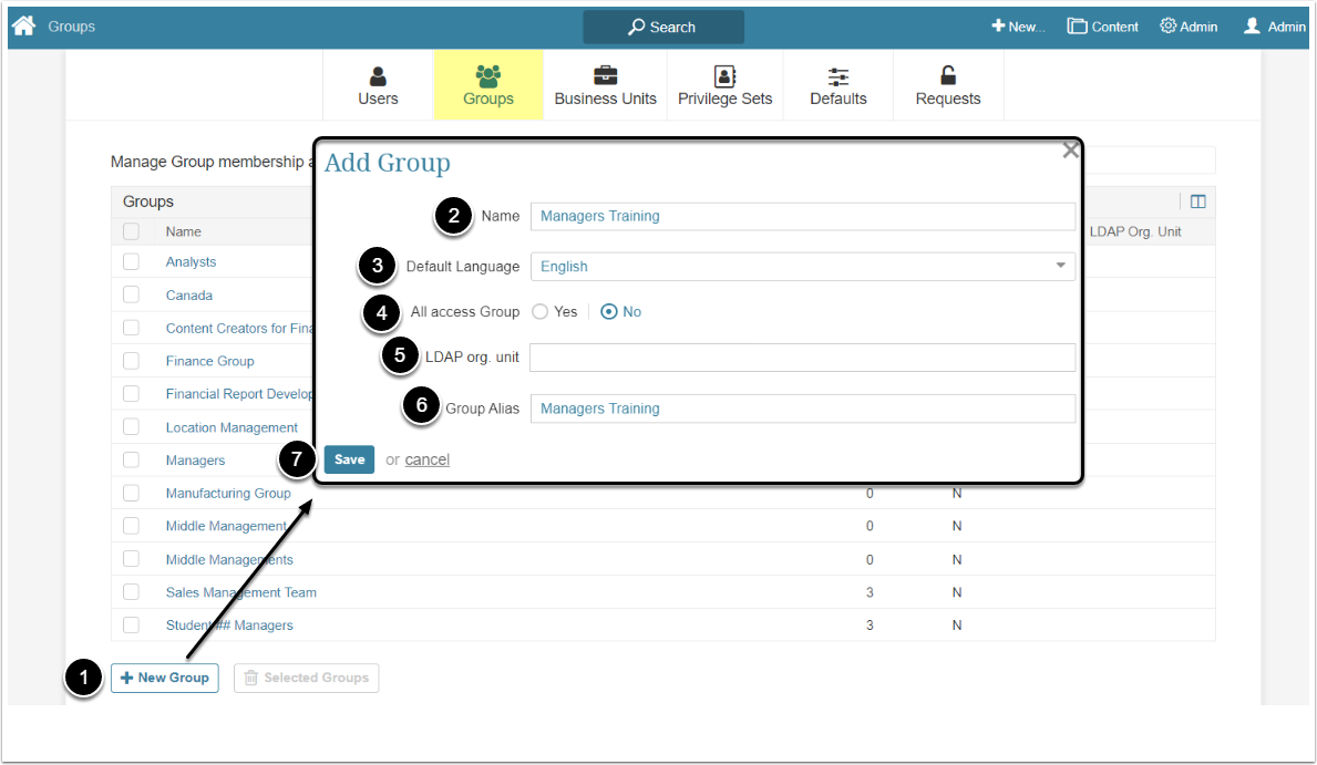 - Default Language: Optionally, select the default language of the group from the dropdown menu