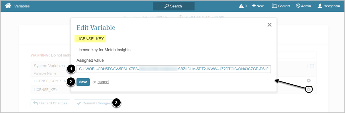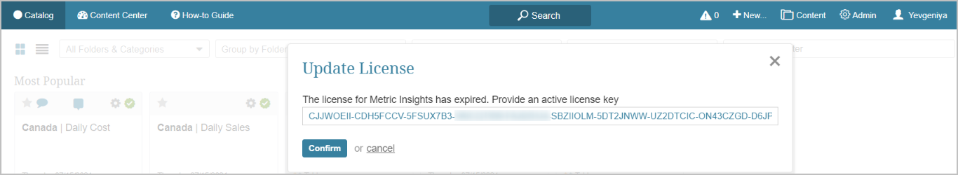 Metric Insights can run a license key check. If you are out of compliance with the terms of your license, every page will display the "Update License" popup to all users of the system. This article shows two ways to update your license key.