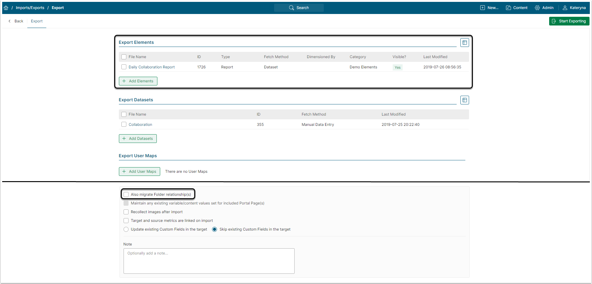 - If the Folder already exists in the target system, it will be updated, and if not, the Folder will be created. This checkbox works with the Elements only