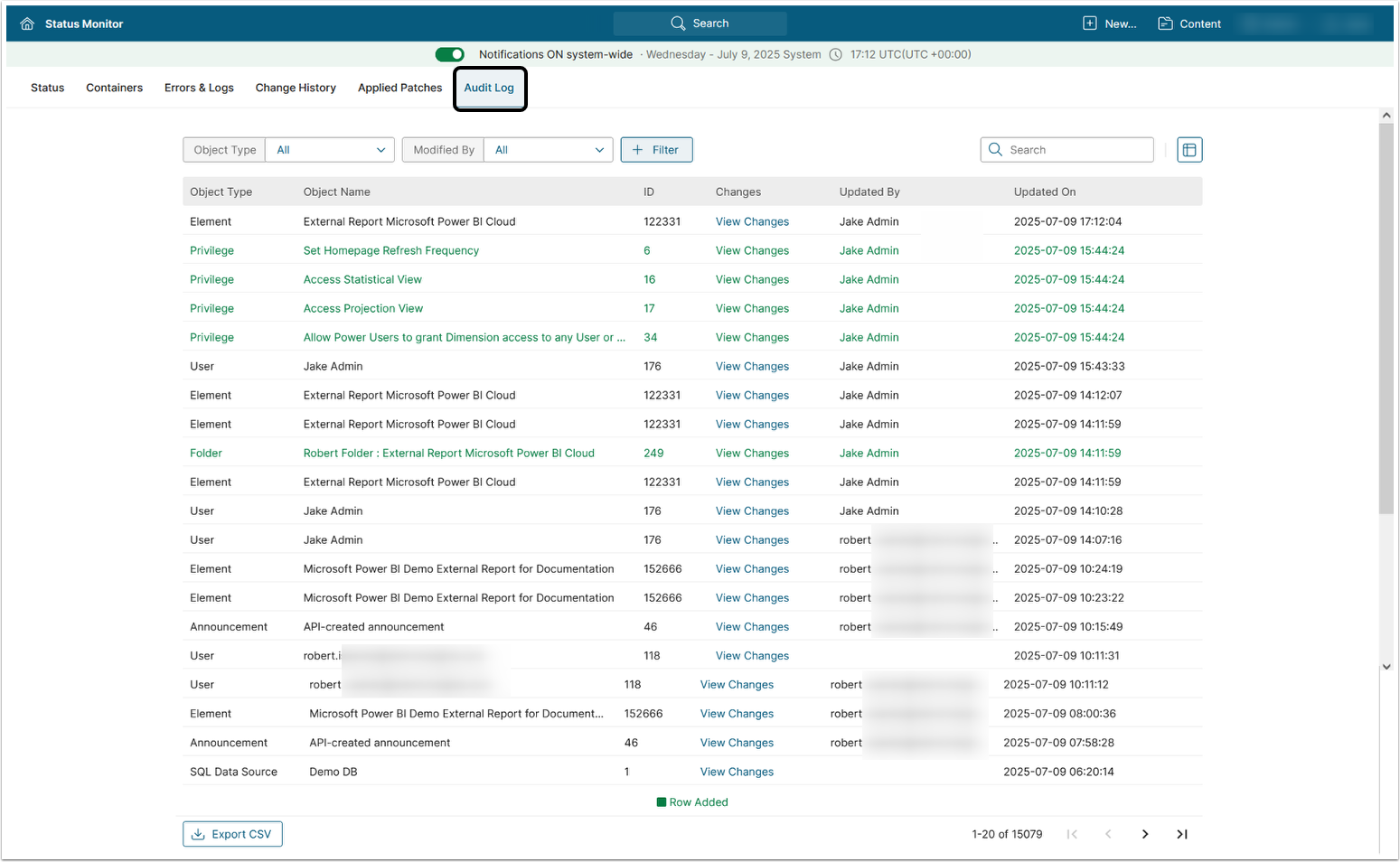 - Bulk Change History: Contains a detailed report on bulk changes, initiated from the Elements list page.