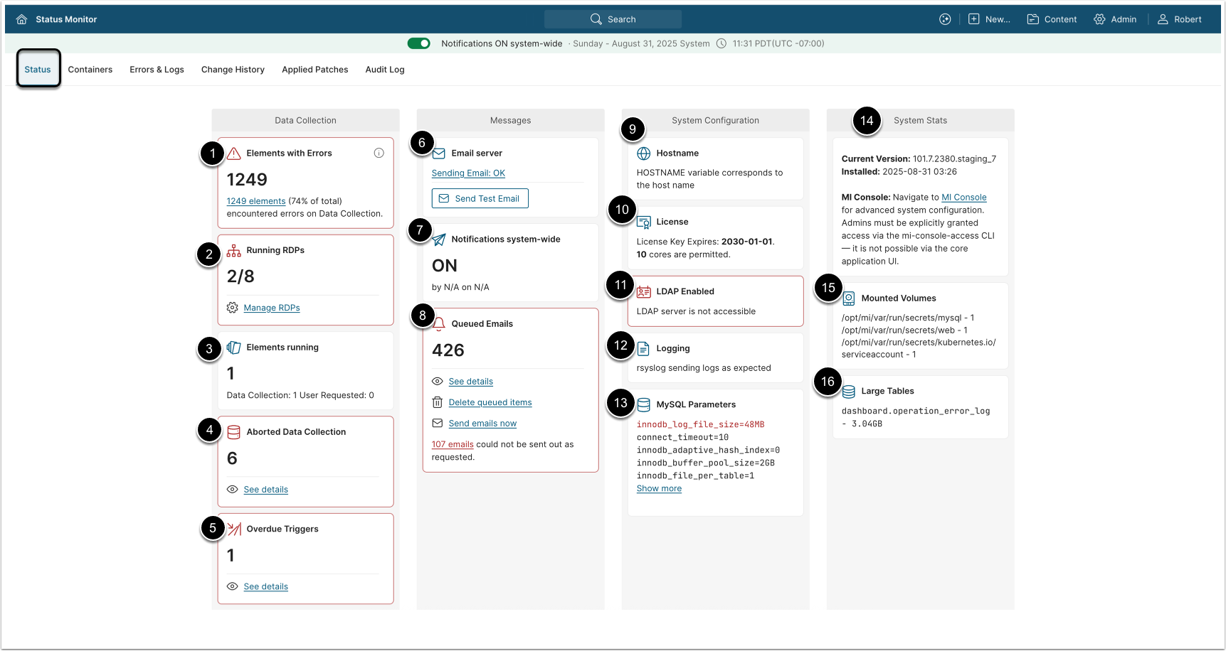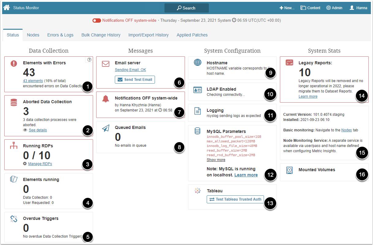 The Status Monitor screen provides details on how your Metric Insights system is functioning, as explained below.