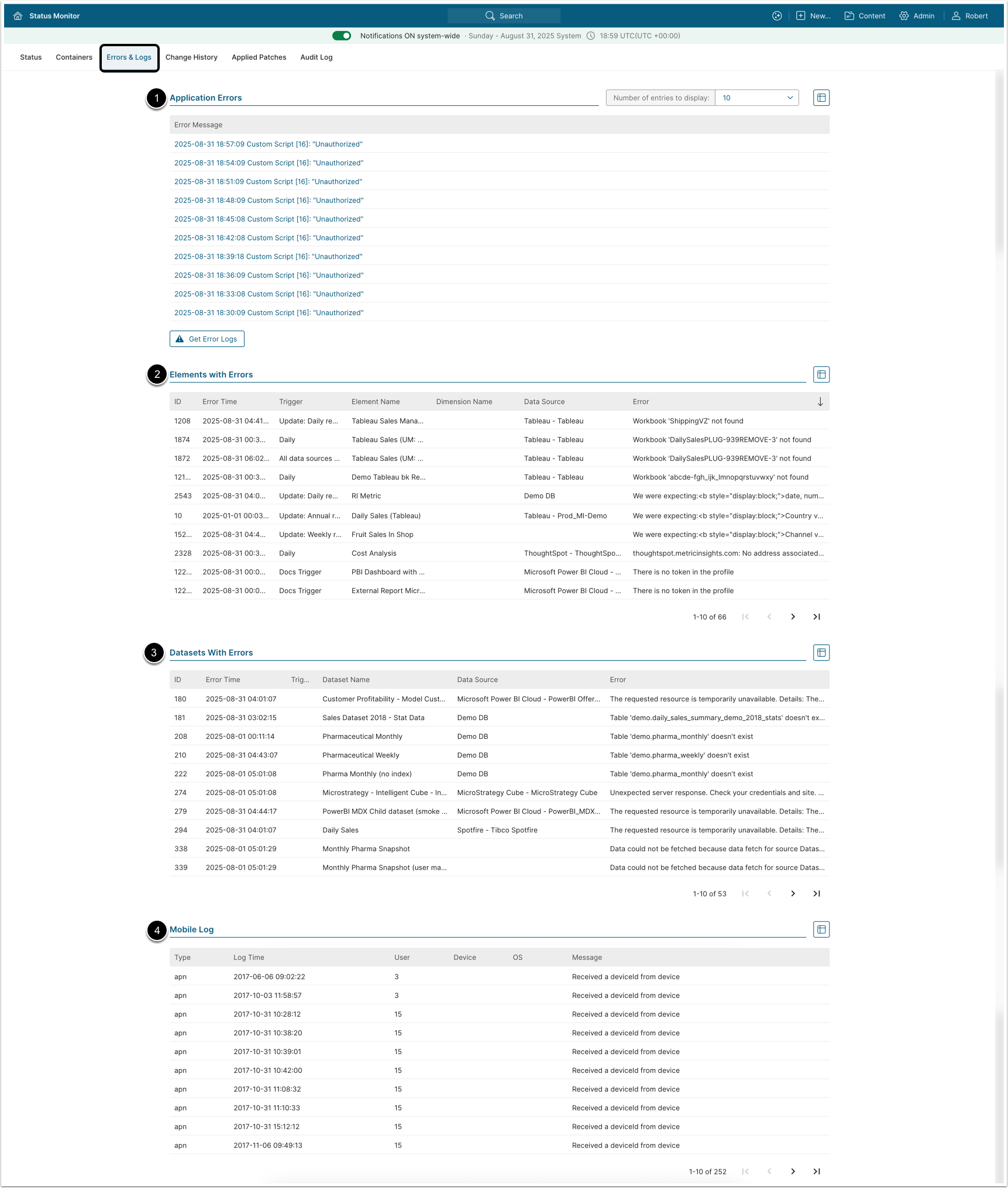 | 4 | Errors & Logs | Includes four tables with the errors and logs reports: Application Errors, Elements With Errors, Datasets with Errors, Mobile Log. For more detailed information related to the tables, refer to Errors & Logs Tab. |