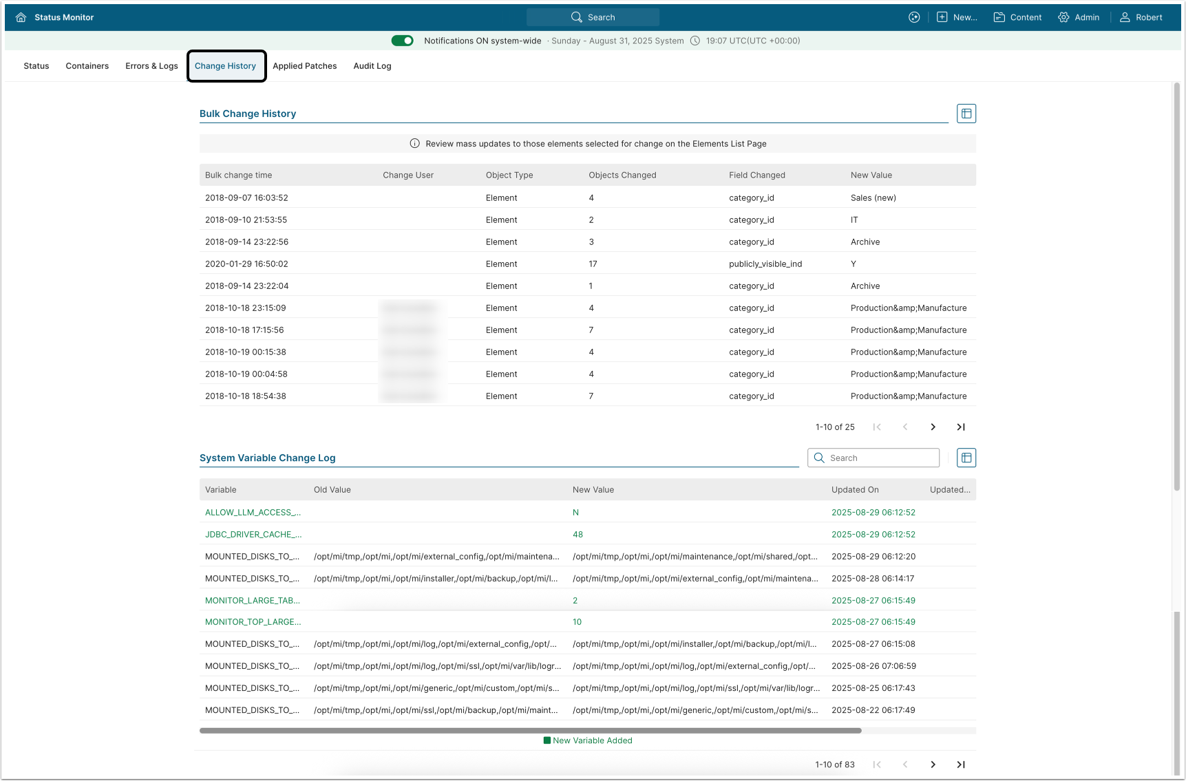 The tab contains a detailed report on bulk changes and System Variable change log.