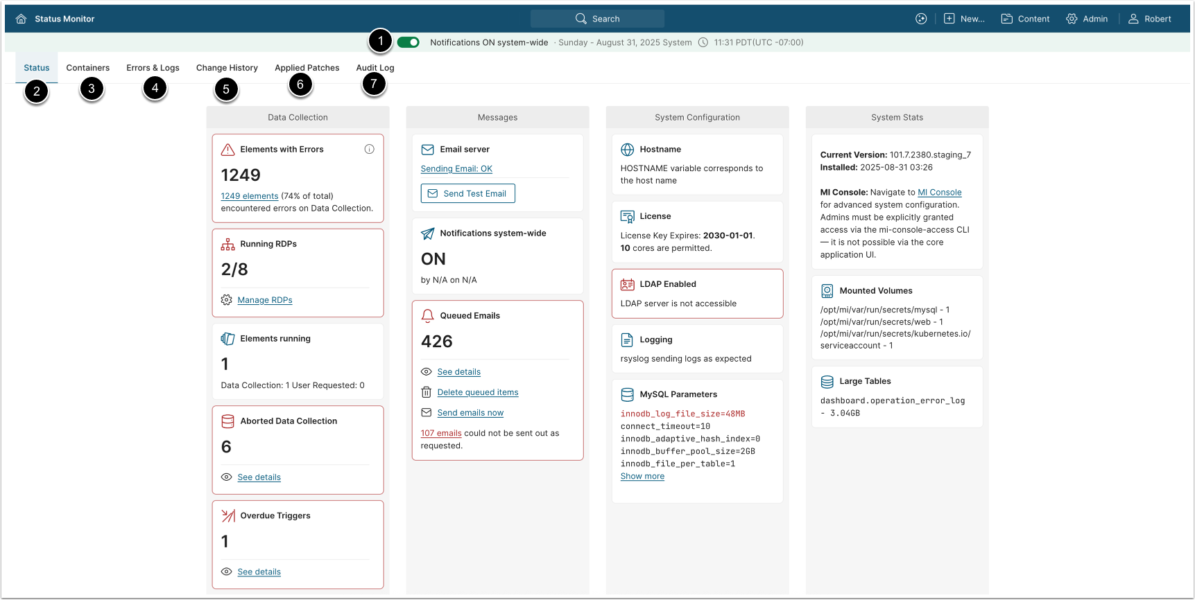 | 8. Queued Emails | Displays a number of queued emails for sending. Email notifications are not sent all at once. They are sent in parts with up to a couple of minutes intervals. |