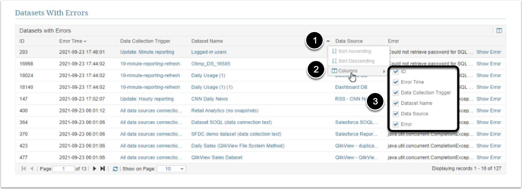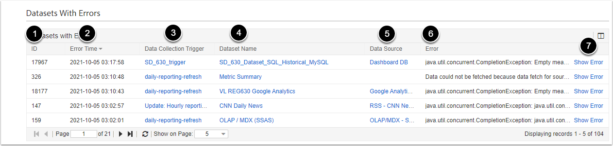 - Datasets with Errors table lists Datasets within which an error occurred. It also shows additional information about the Dataset and describes an error.