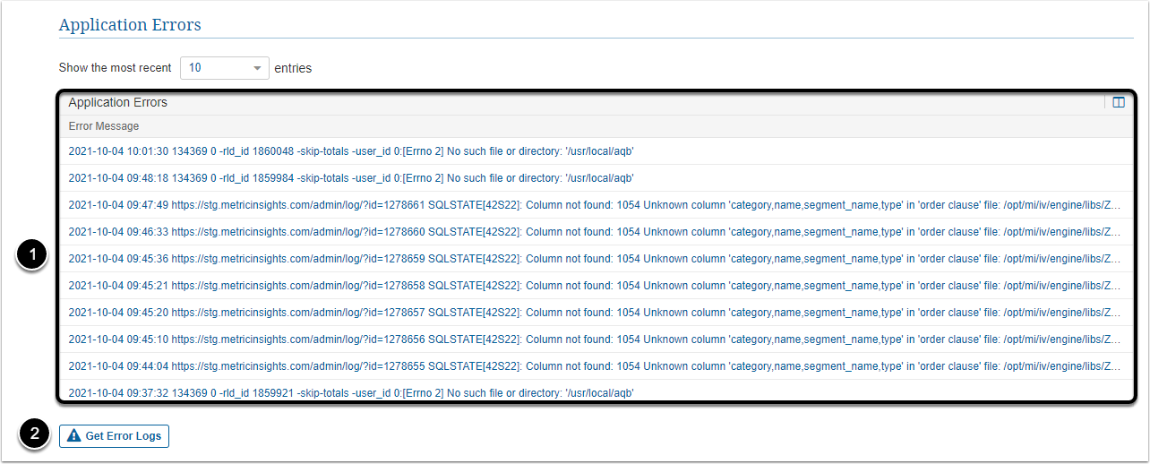 Application Errors table displays informational messages related to the applications. To read the whole notification, click required message. - [Get Error Logs] to download the logs file or send it to MI support via email.