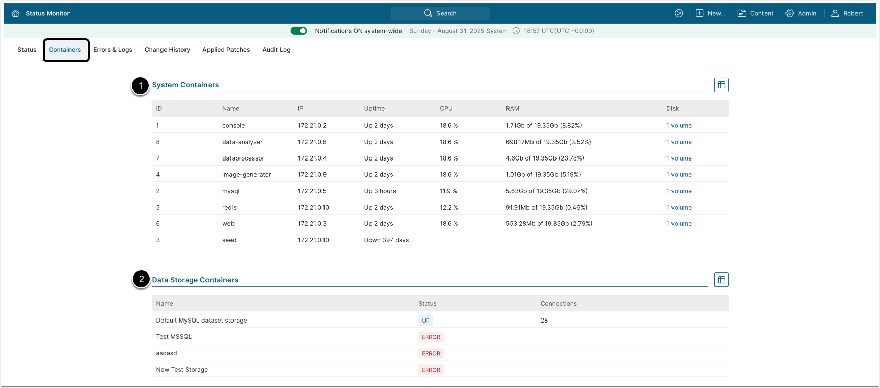 - Data Storage Containers table displays the list of Data Storages where Datasets are stored, with information about their titles, status and number of active connections.