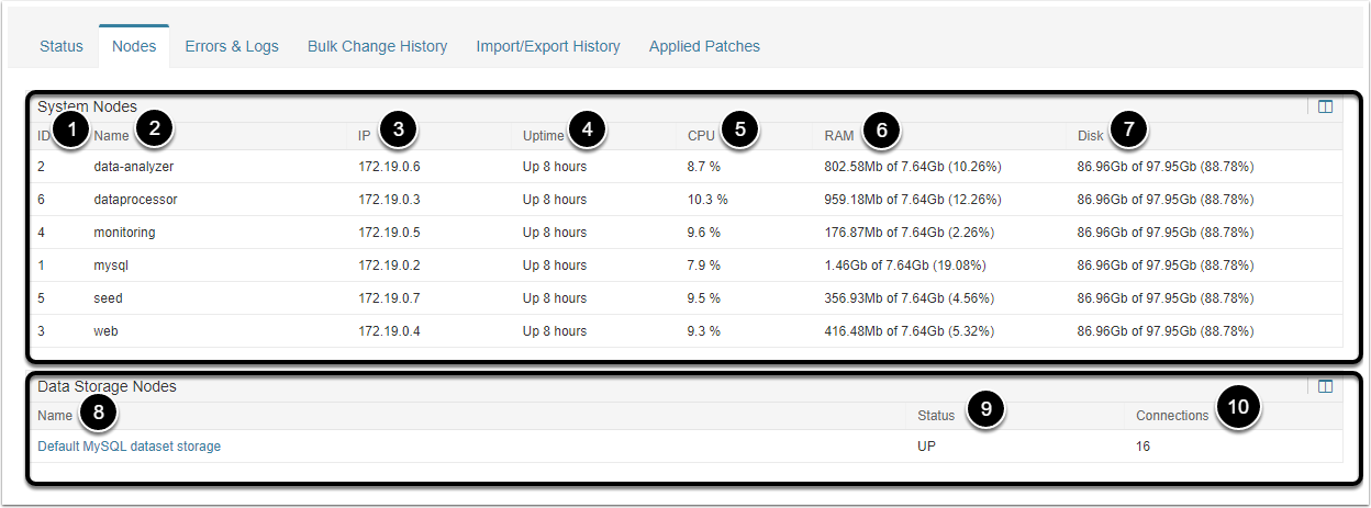 | 3 | Nodes | Contains a common data about System Nodes and Data Storage Nodes. For more detailed information, refer to Nodes Tab. |