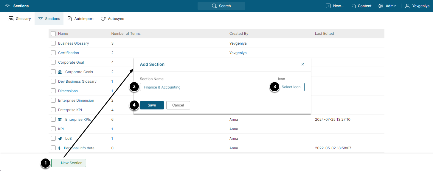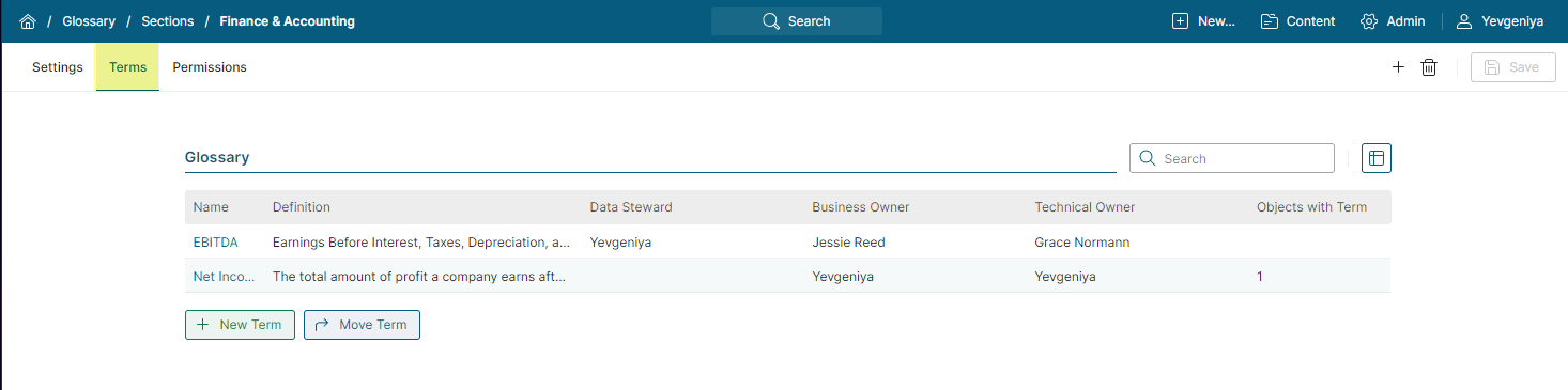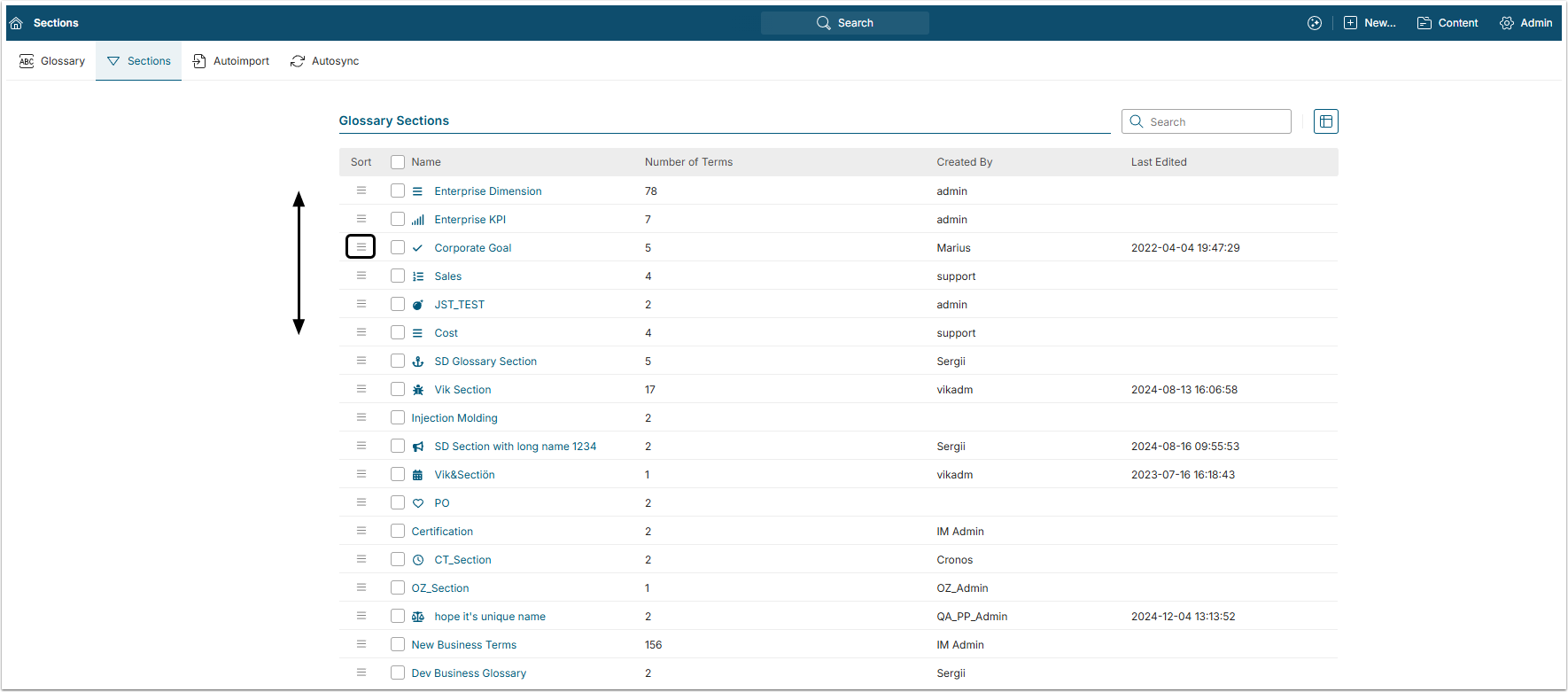 Glossary Sections provide the ability to group Glossary Terms into meaningful divisions. All Terms are required to be associated with a single Section.