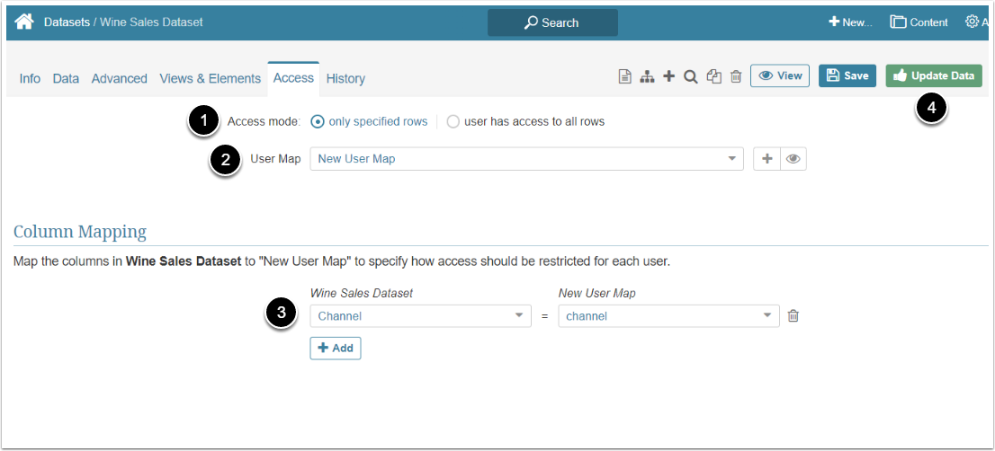 User Maps allow defining the slices of data that specific users are allowed to see in the Dataset Viewer and the Report Viewer for any Reports created from that Dataset.