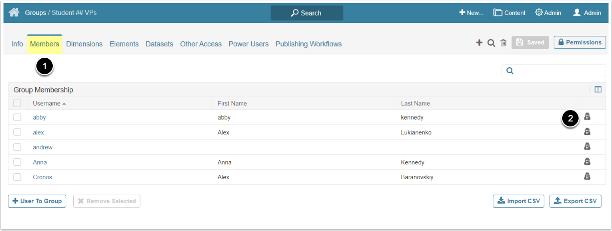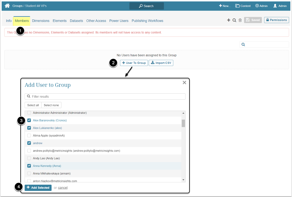 - Open Members tab- If you are a Power User, than access Admin > Groups, click on the title of the created Group and open the Members tab