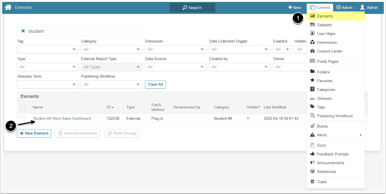In this example, the Admin has a request from a business unit that oversees company Wine Sales. They request that the Metric Insights Catalog display content from a dashboard pre-filtered for specific users; e.g., the manager who works only with the online purchases needs to see the data filtered by the "website" channel of sales on the first place. Use the example workflow outline below to: