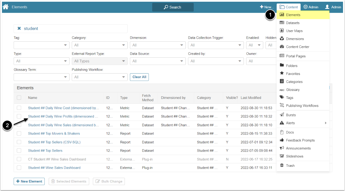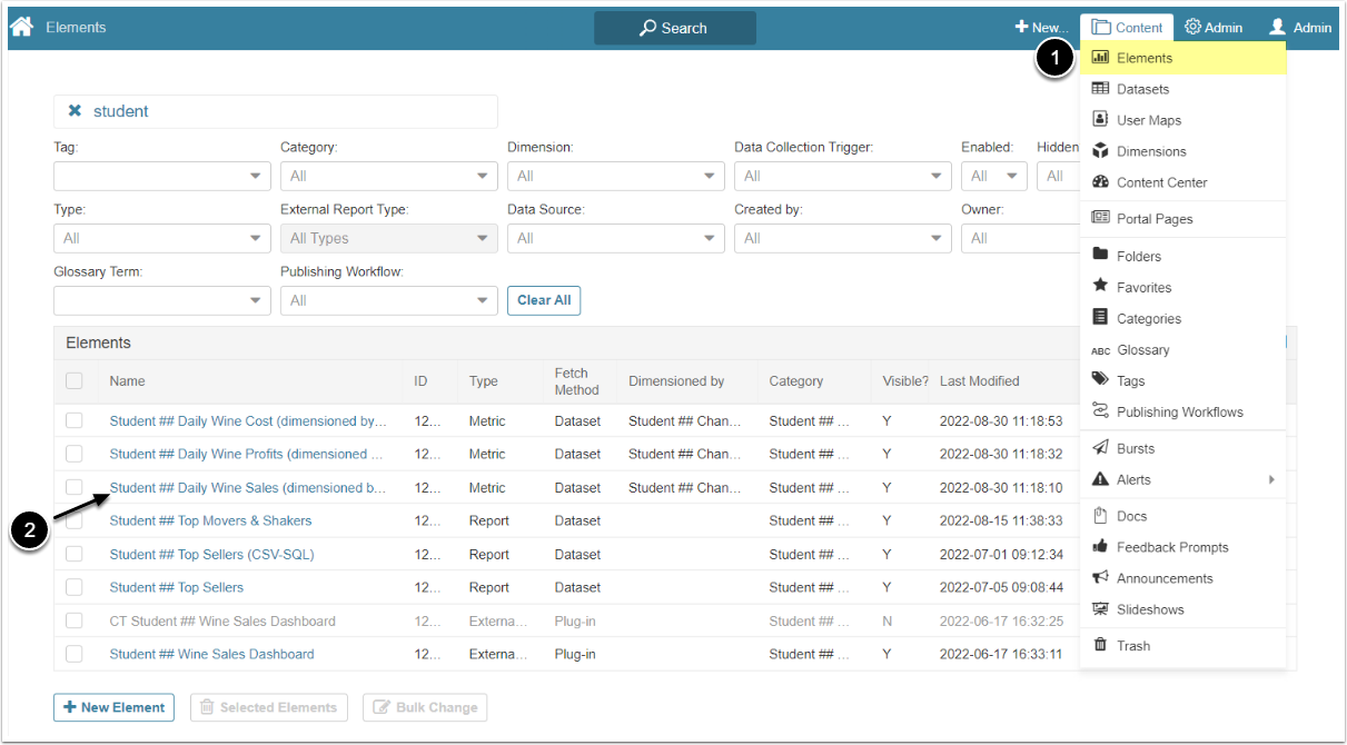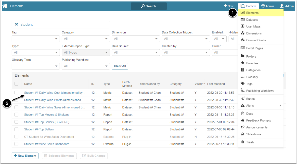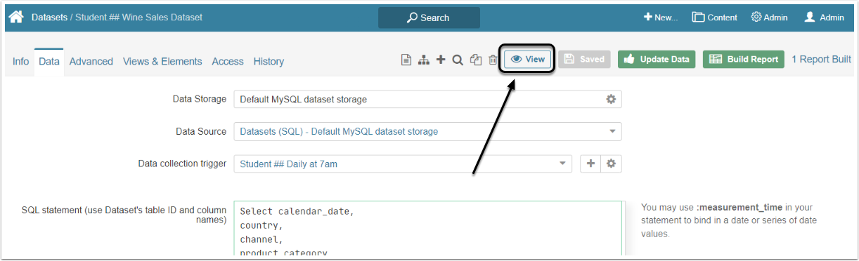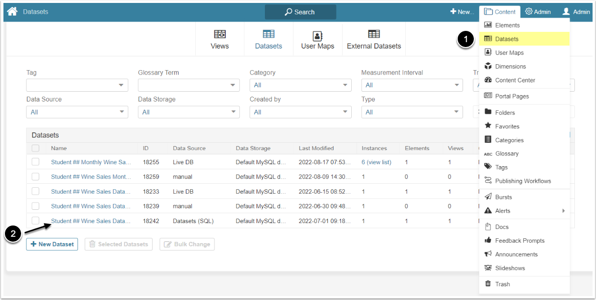 - Find the "<your name> Wine Sales Dataset" Dataset you created in Training by Example: Use Case — Exceptions Report and click its Active Name Link
