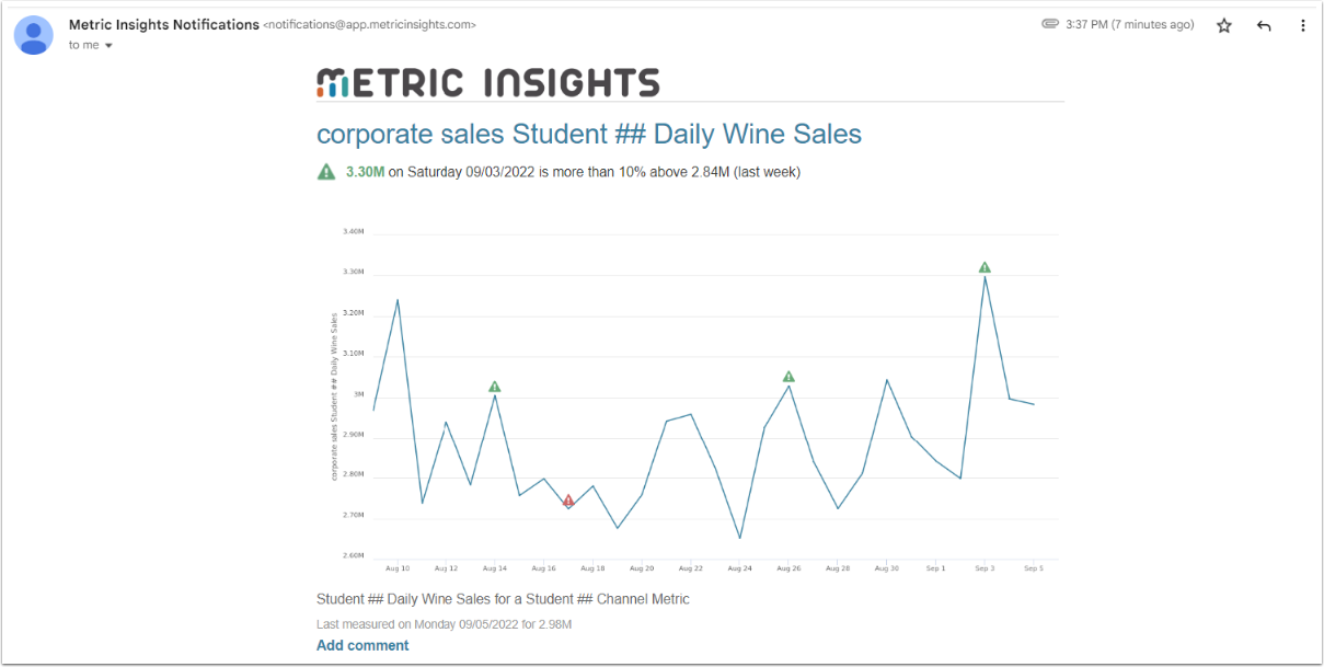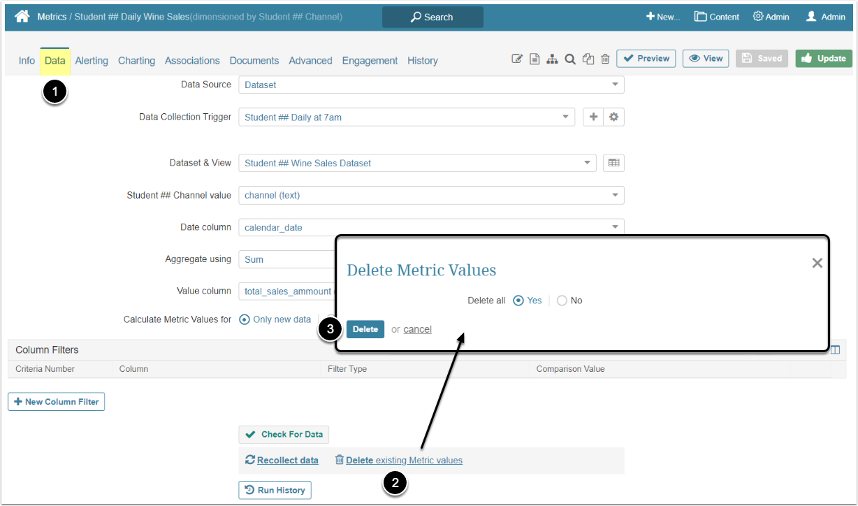 Alerts are sent only when they occur. However, they will also be sent to the Users if the data is recollected. So, in this step you will delete all the Metric data and recollect it. You will do it only for the "<your name> Daily Wine Sales" Metric, just to check the Alert notification.