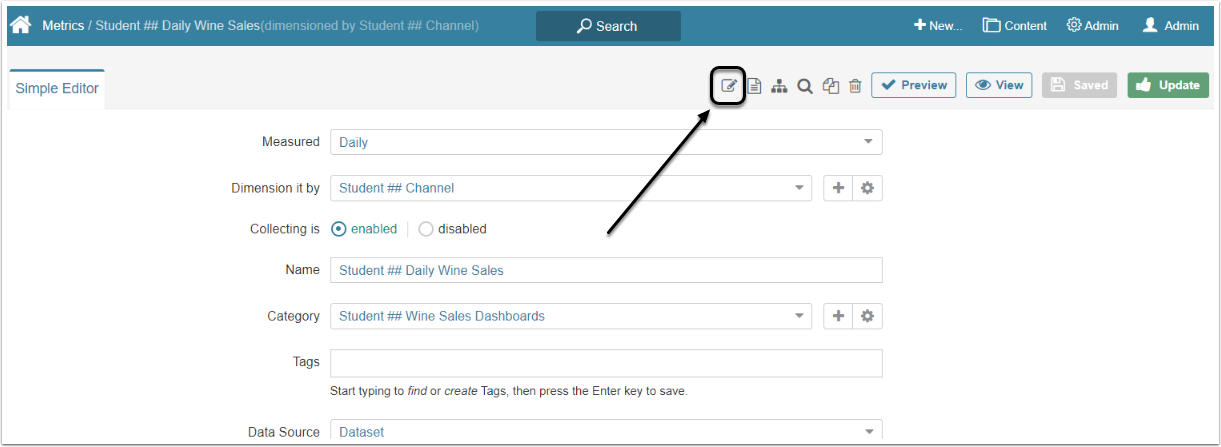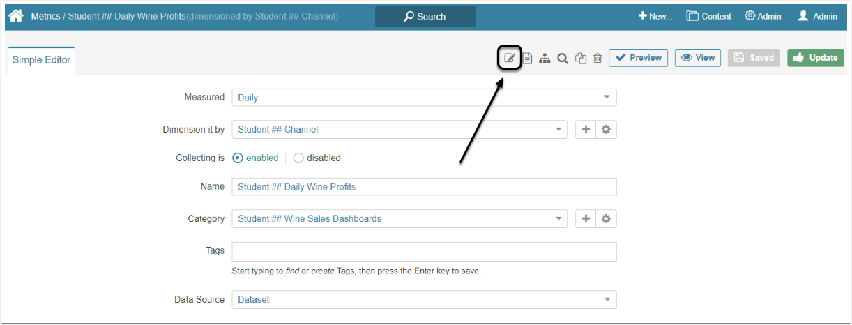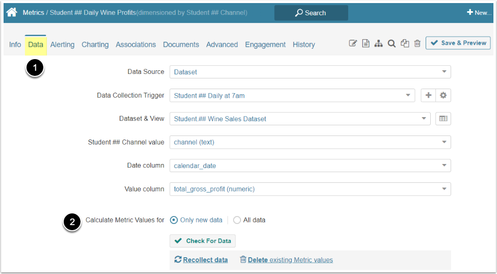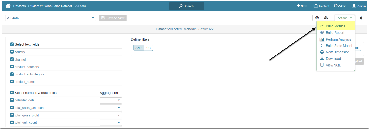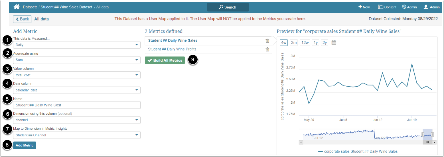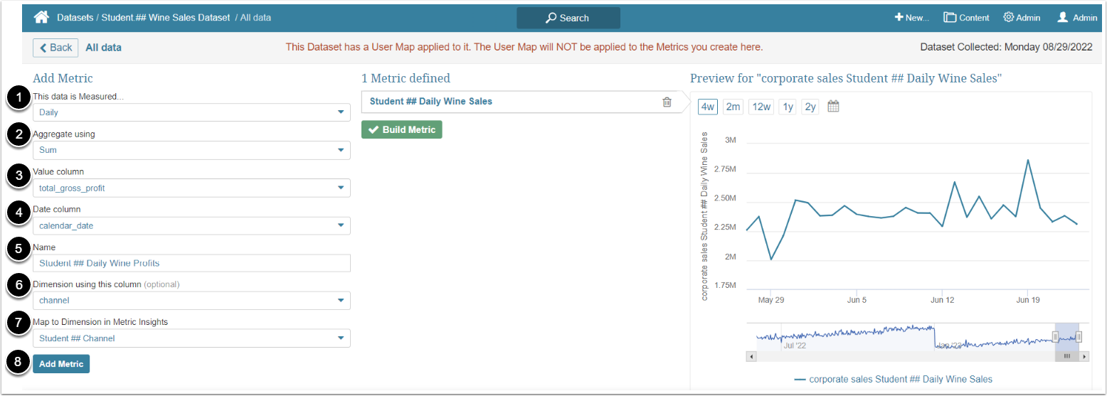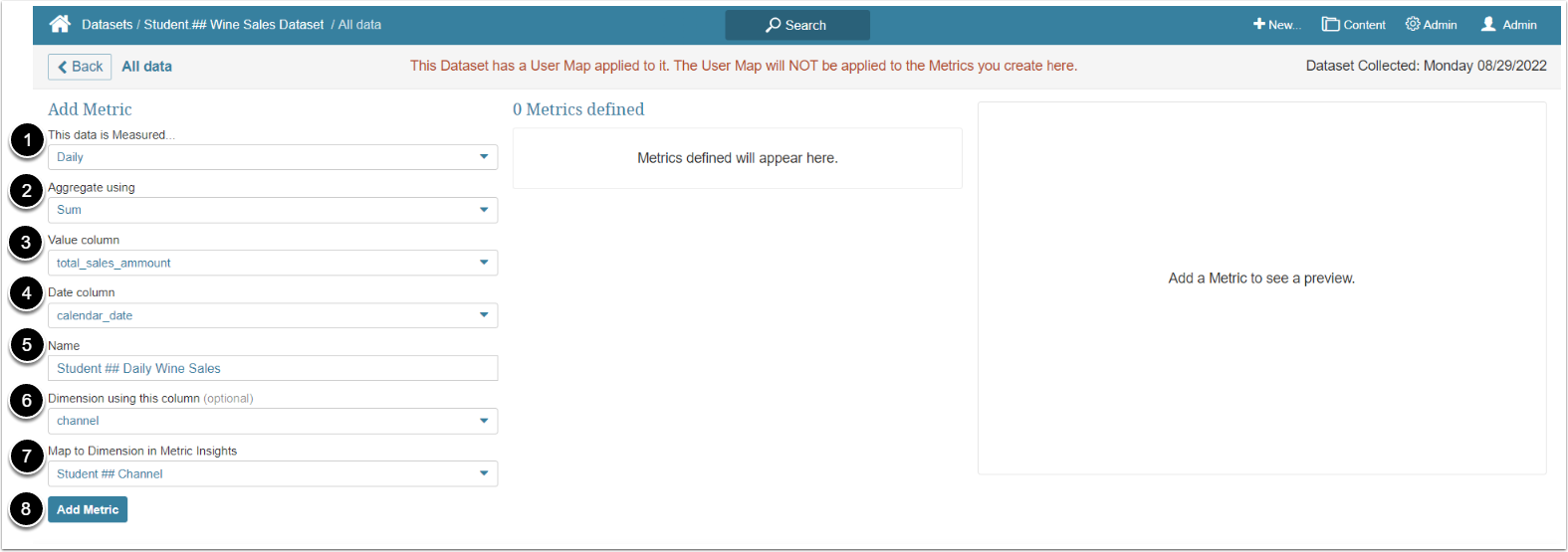- Name: Name the Metric "<your name> Daily Wine Sales". In this use case "Student ##" is used instead of a name