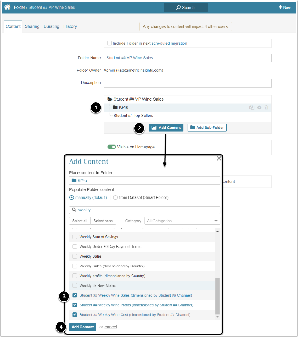 In this example, a business unit that oversees the company's Wine Sales requests a series of metrics for employees that demonstrate a high-level perspective of sales, costs, and profits by sales channel. Those metrics have to be included in weekly Bursts. Additionally, a Daily Alert should be distributed if: