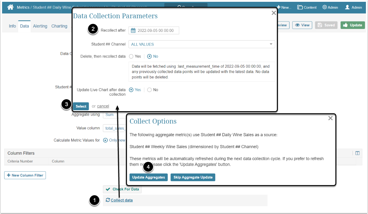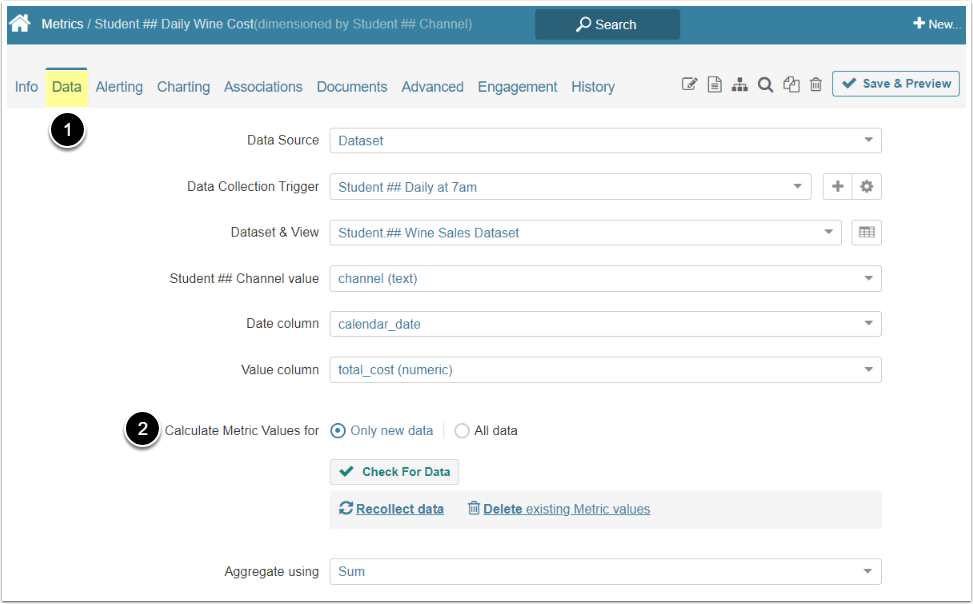 In this section, you will learn to create a Metric from the Dataset. Besides that, you will create an Aggregated Metric. Aggregate Metrics are not bound to any particular Data Collection Trigger. The Metric's data is updated automatically each time its Source Metric's data is updated or changed.