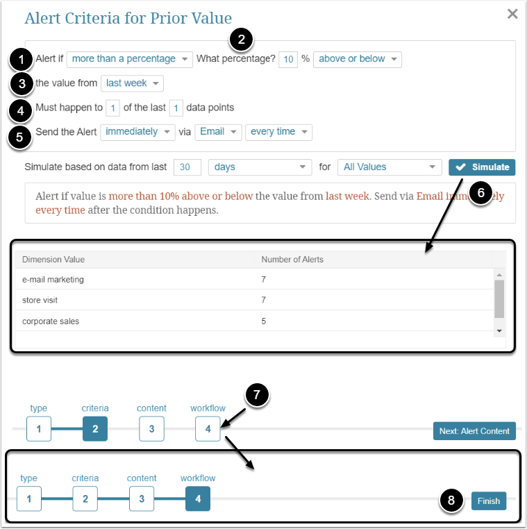 - Optionally [Simulate]. It will show the number of alerts for every Dimensional Value