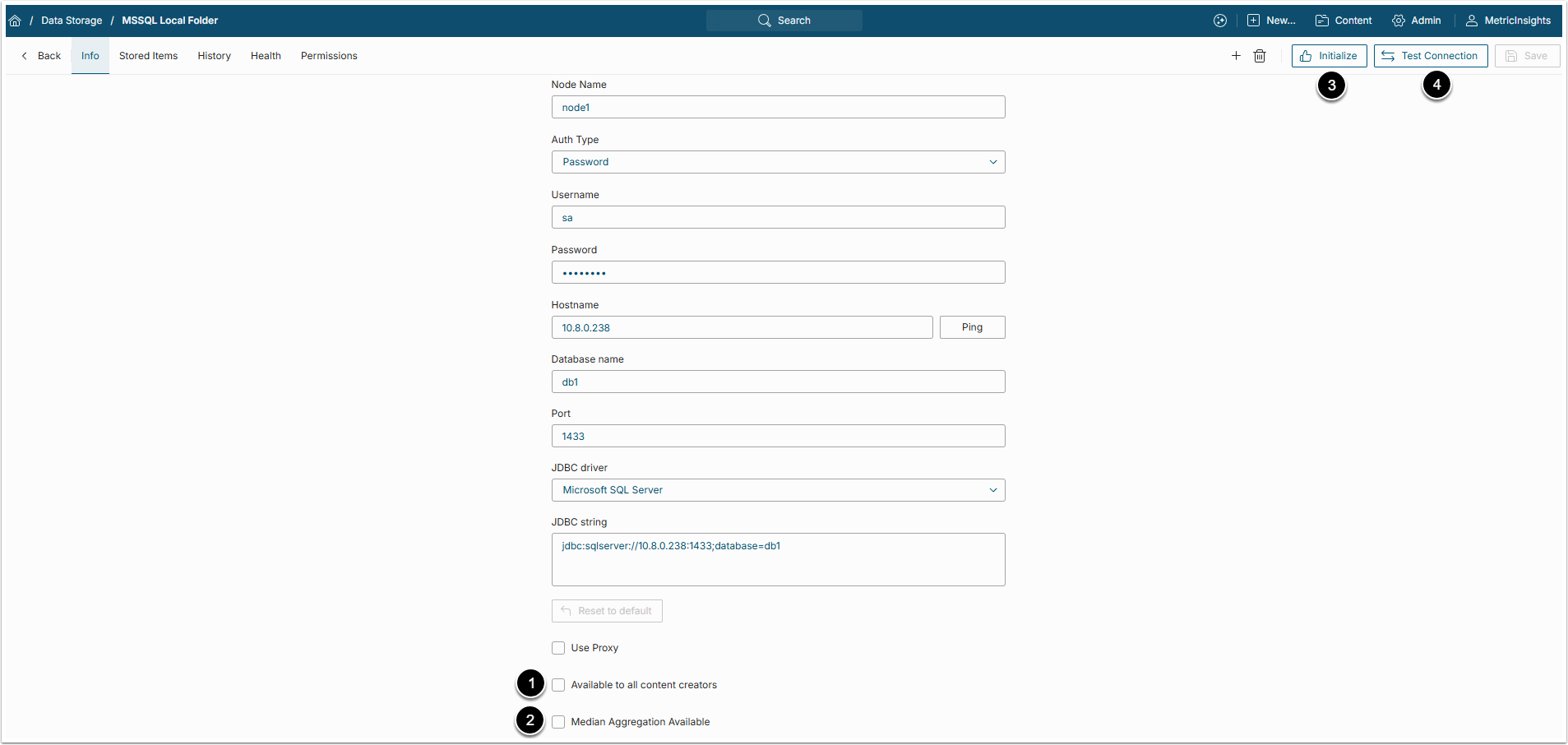 - Database name: Enter the name for MS SQL Server Database where MI Datasets will be stored.