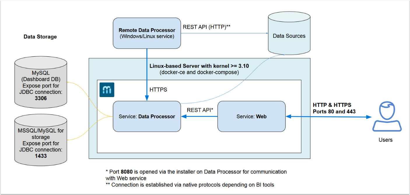 - Communicates with the databases: MySQL Dashboard Database (contains metadata) and MSSQL/MySQL Storage