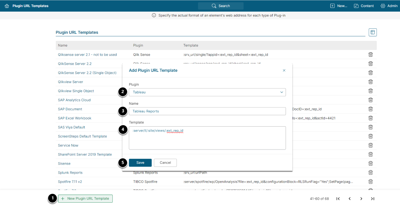 - Admin > Plugins > Plugin URLs. If the URL is generated automatically, it requires a Template to indicate what variables should be included into the URL. Template typically includes variables related to the location of the data in the source system and the ID of the object to be fetched.