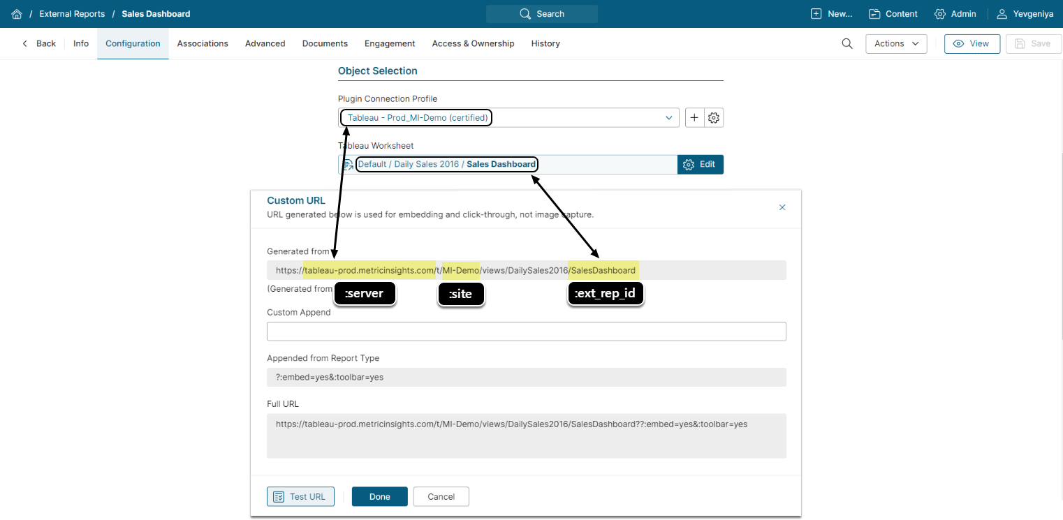 :server/t/:site/views/:ext_rep_idThe selection in the Plugin Data Source and Tableau Worksheet fields provides substitutions for corresponding variables. This is how the URL is automatically generated for the External Report.