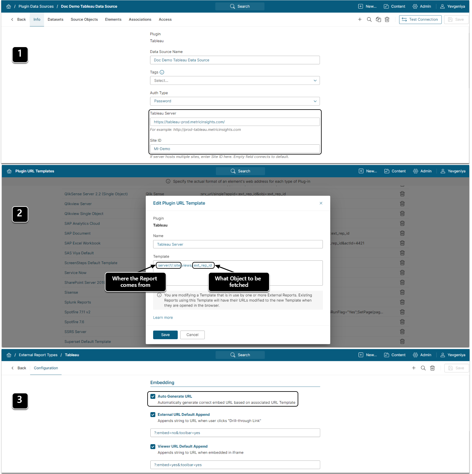 - Admin > Collection & Storage > Data Sources. When a new Plugin Connection profile is created, the system requests certain required Parameters. They are required because they usually point to the location of some information in the source service. One of the typical required parameters is a server or endpoint. The given example is for Tableau. Required parameters for Tableau include Tableau server and Site ID.