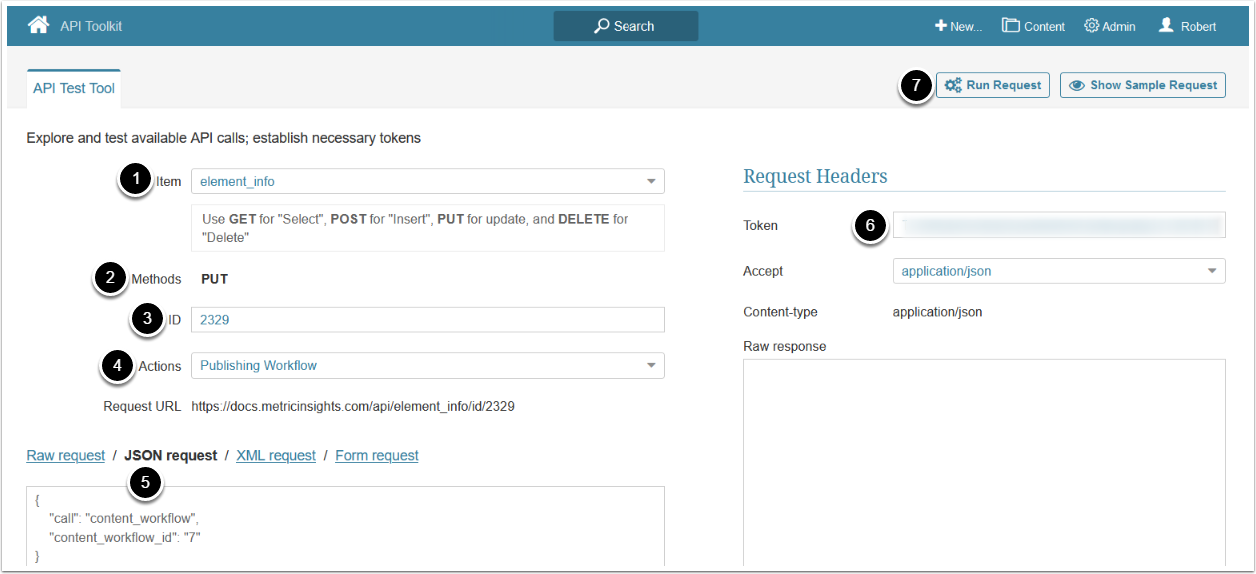 - Select JSON request and replace request with the following JSON providing the needed values:
