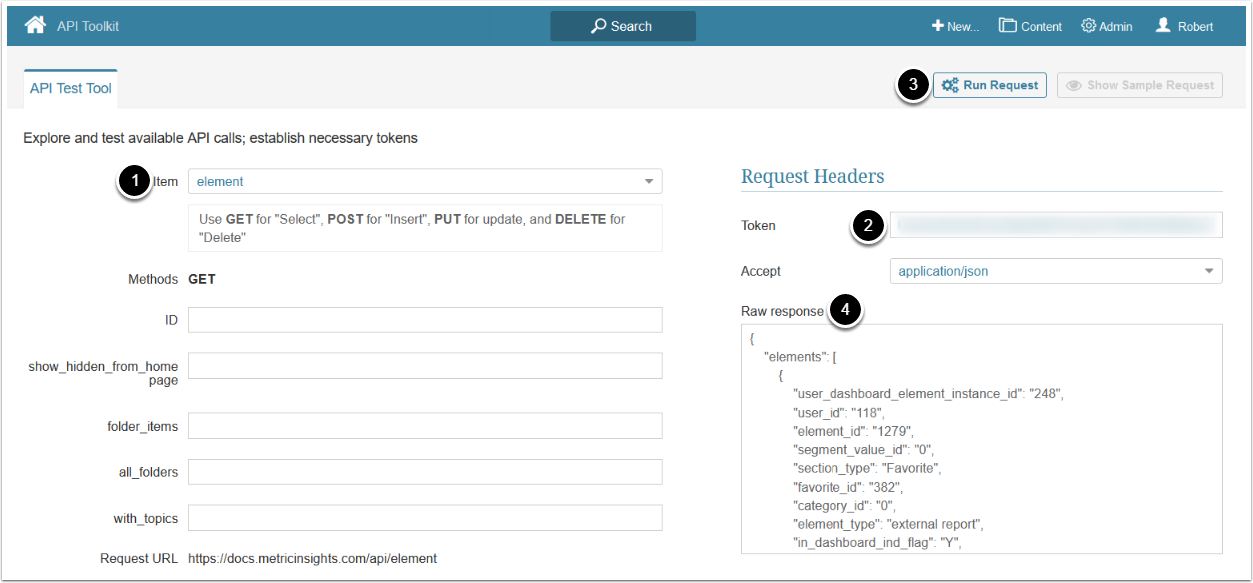 /api/element: Returns Elements available to a user, including options to retrieve all Elements (including hidden items), associated Folder items, Tags, and Glossary Terms.