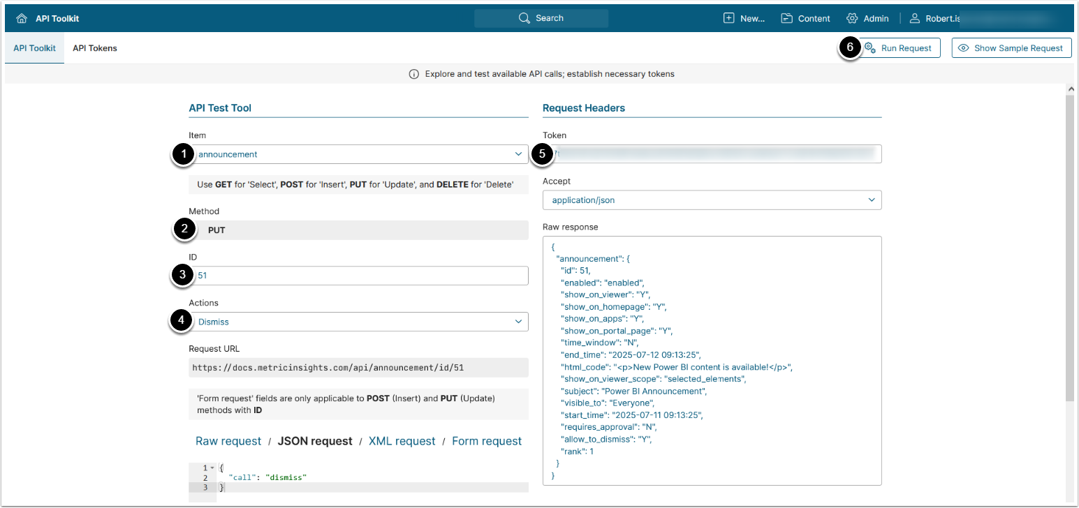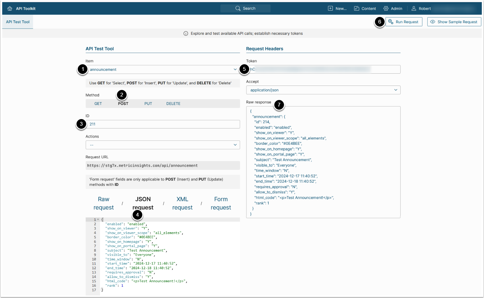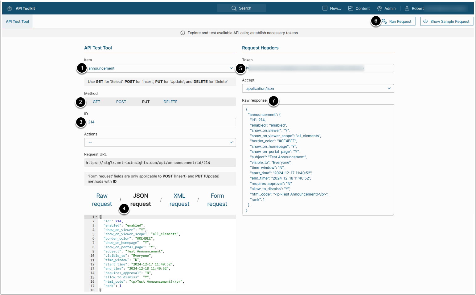 - Select JSON request and enter JSON with the updated Announcement's data- See Example Response for details on Announcement's data