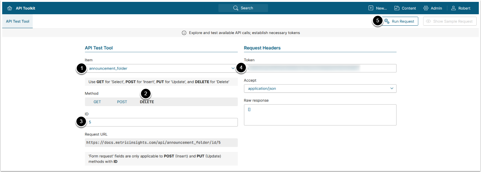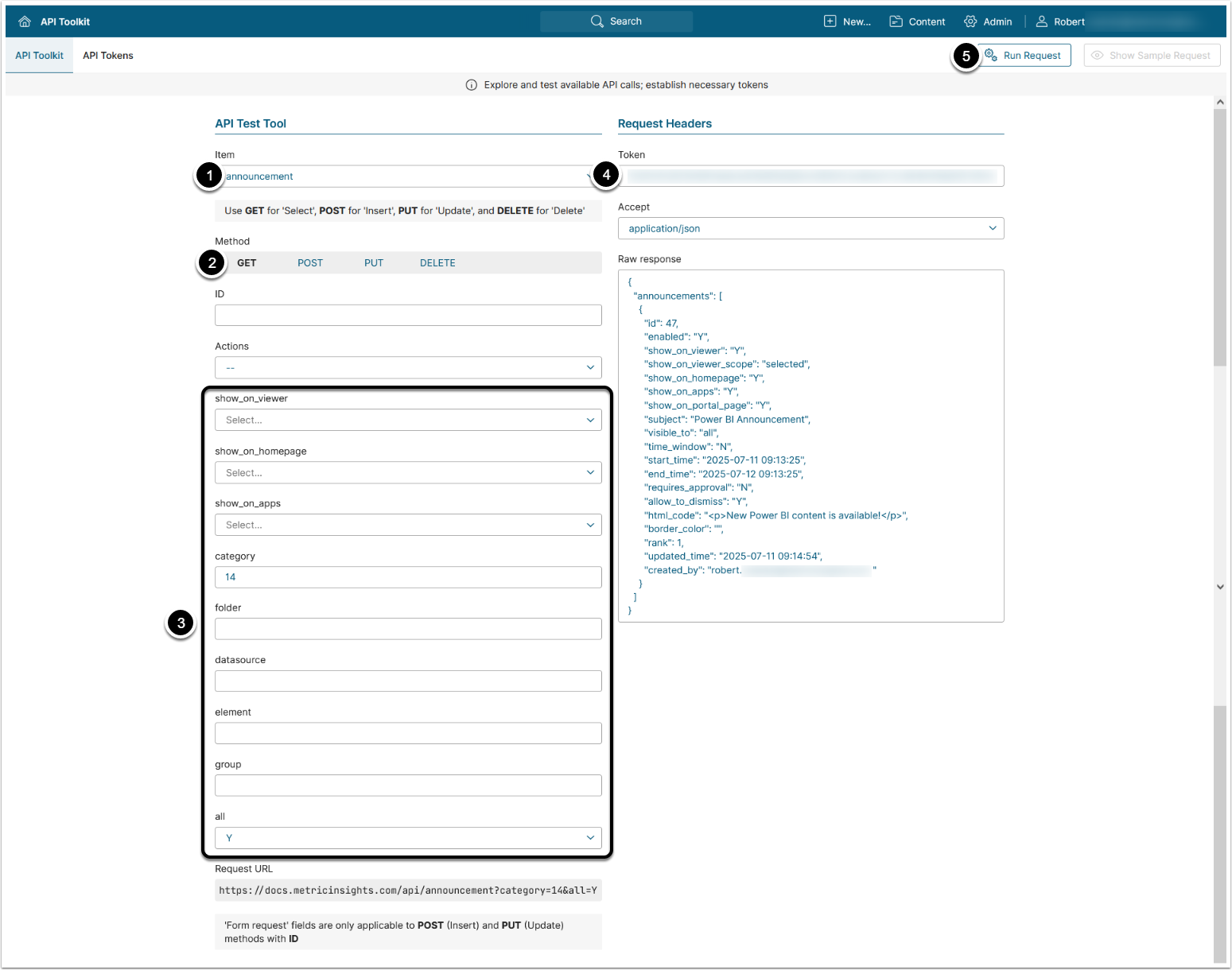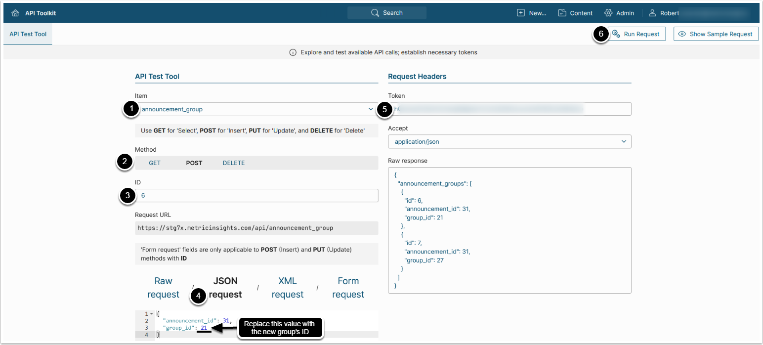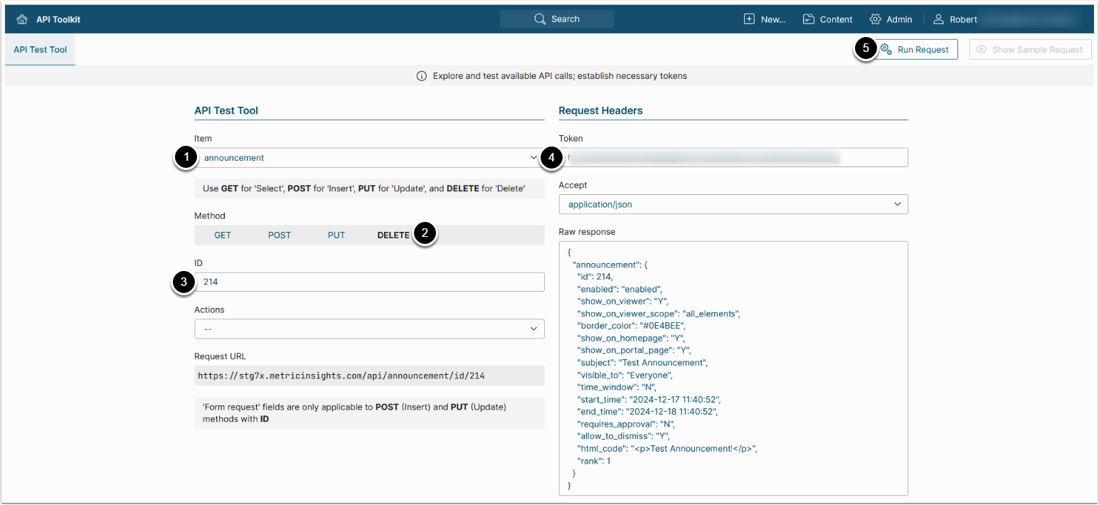 - Select JSON request and enter JSON with the updated Announcement's data- See Example Response for details on Announcement's data