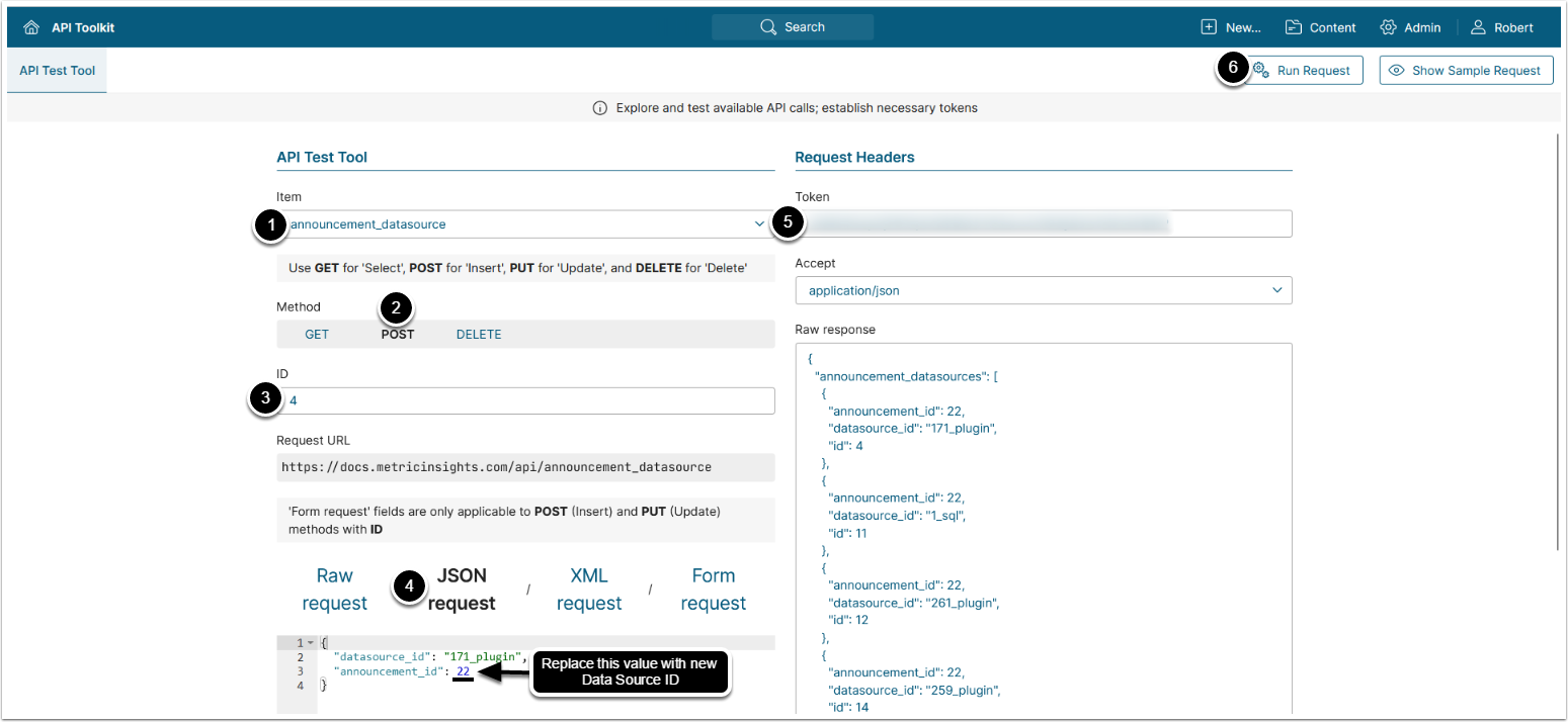 - Select JSON request and replace the value of the datasource_iddepending on the Data Source type:- Plugin Data Source: <Data Source ID>_plugin