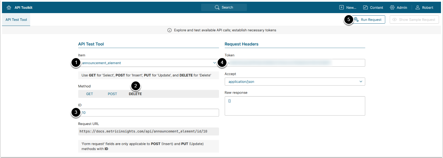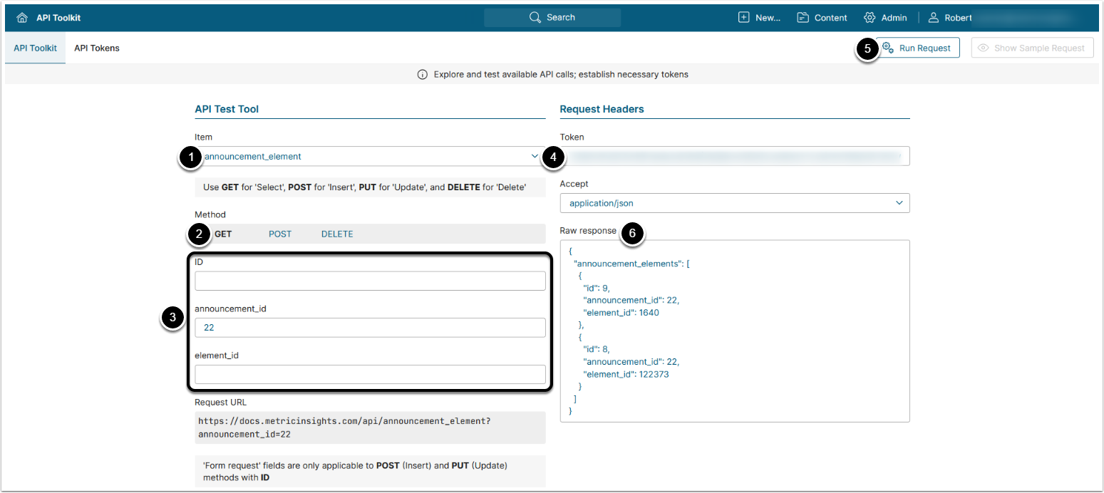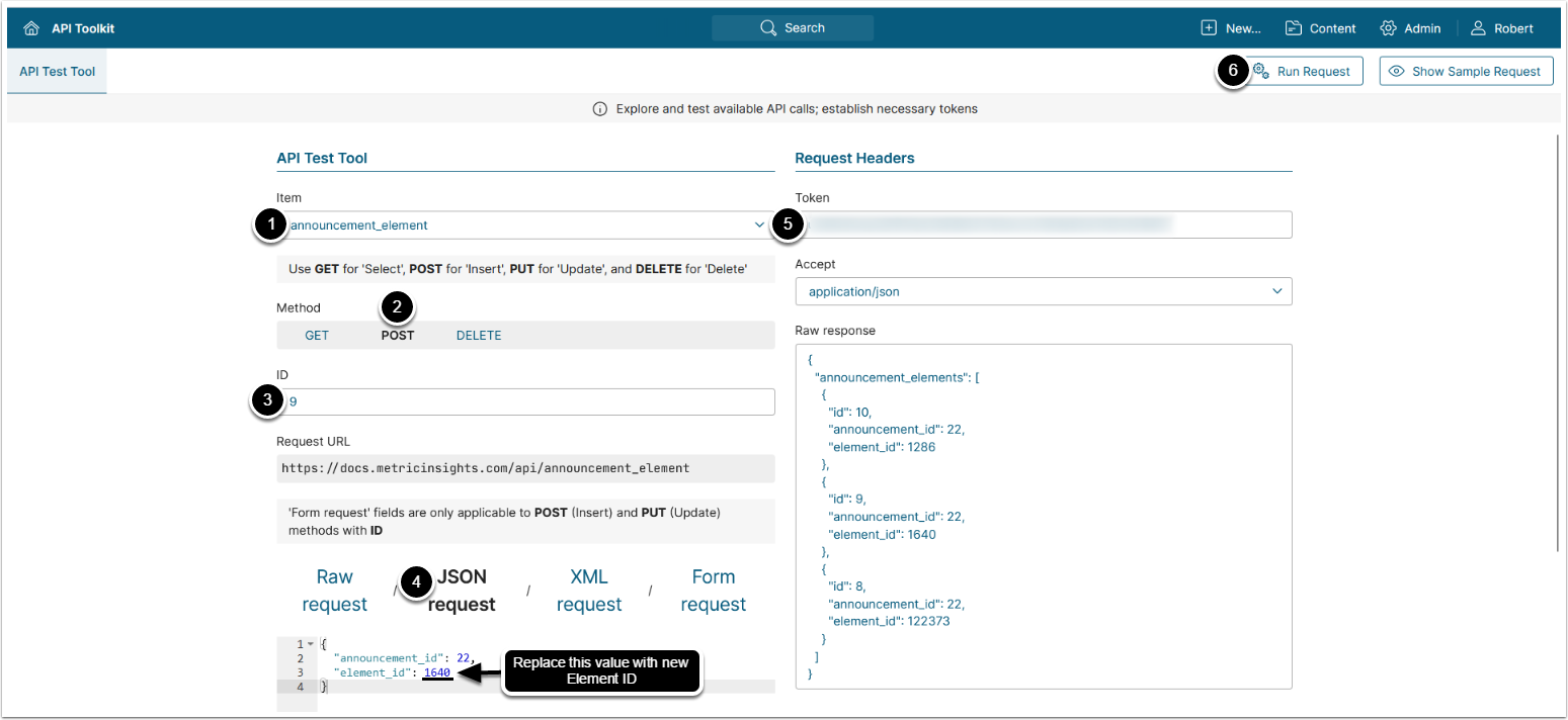 - Select JSON request and replace the value of the element_idwith the ID of the Element that needs to be added to the Announcement