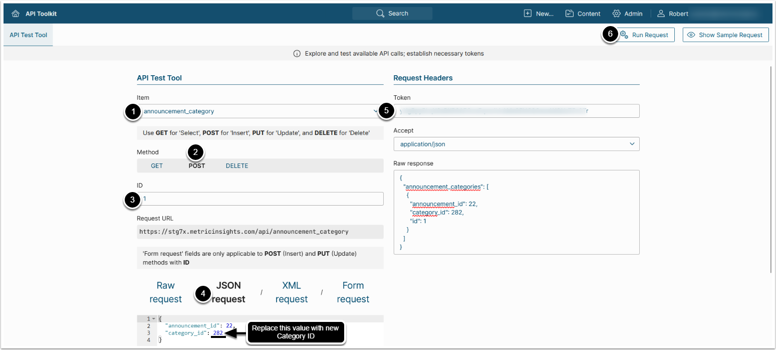 - Select JSON request and replace the value of the category_idwith ID of the Category that needs to be added to the Announcement