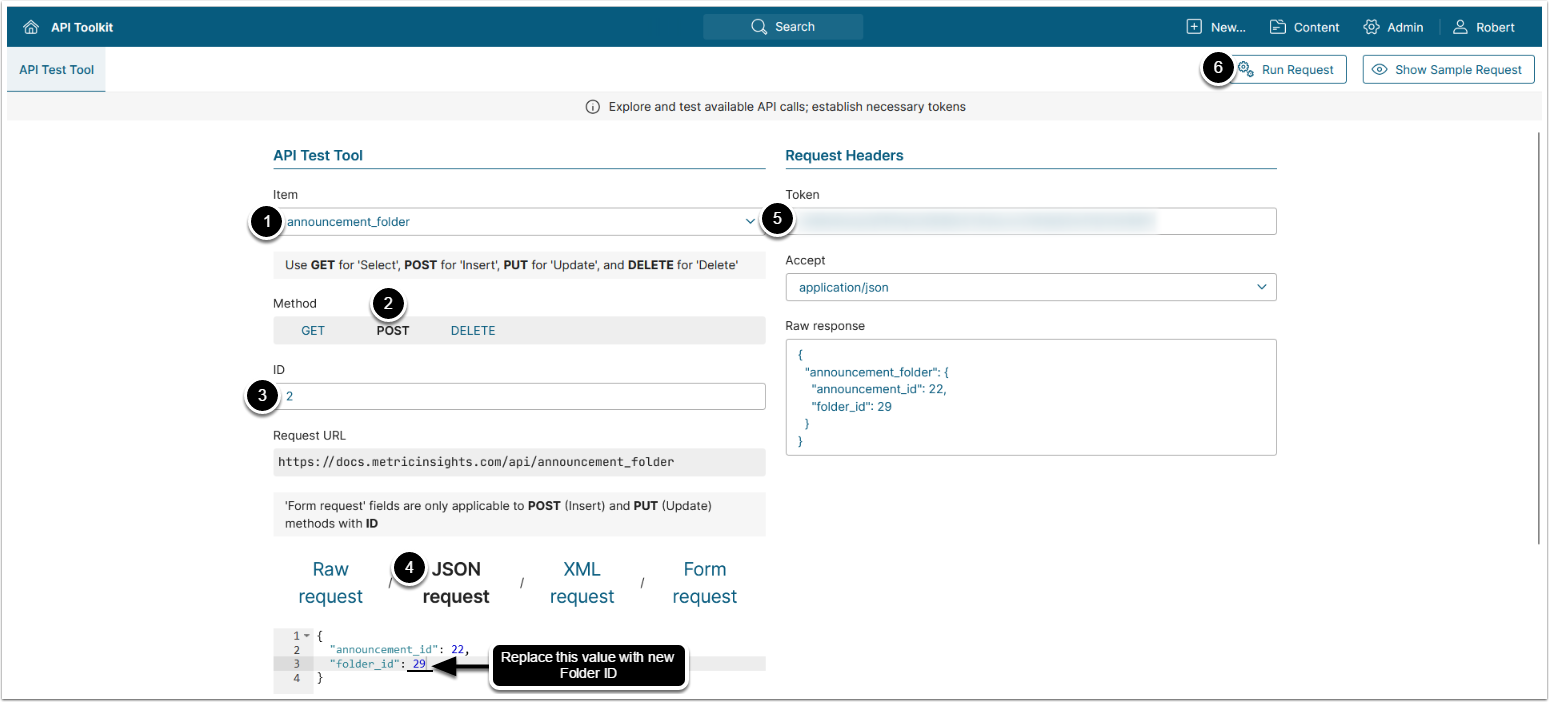 - Select JSON request and replace the value of the folder_idwith the ID of the Folder that needs to be added to the Announcement
