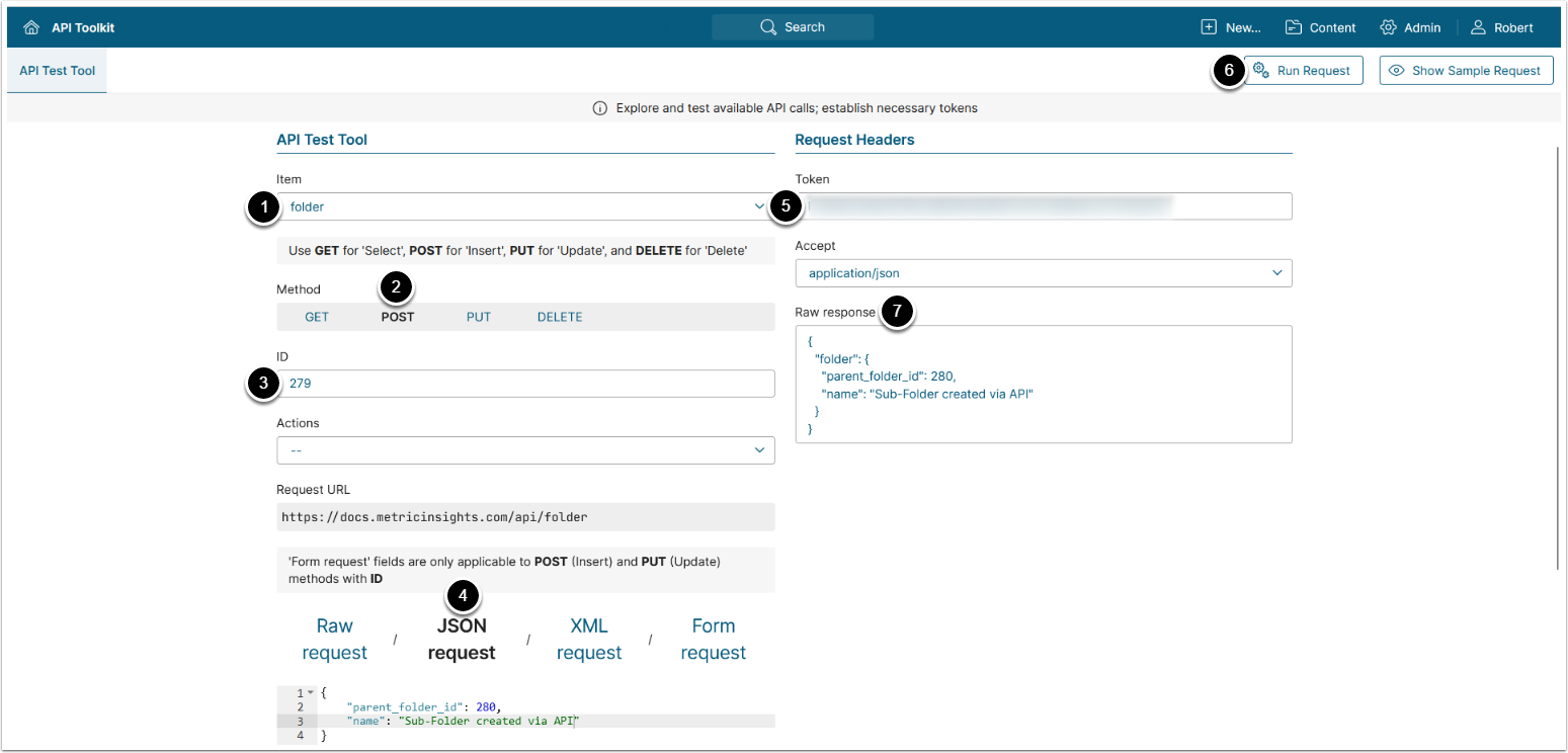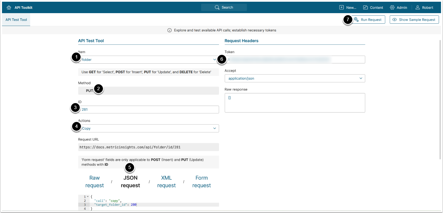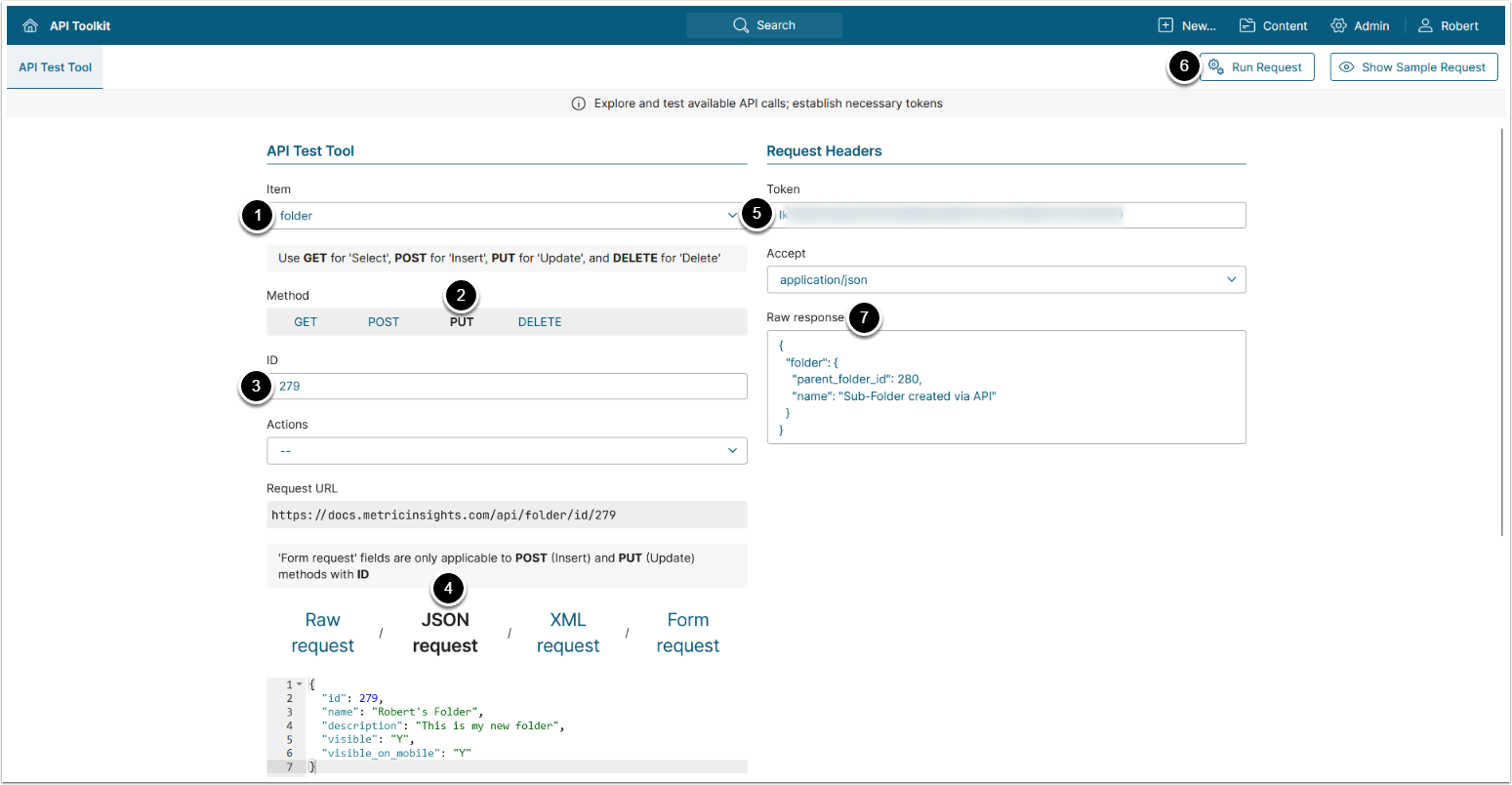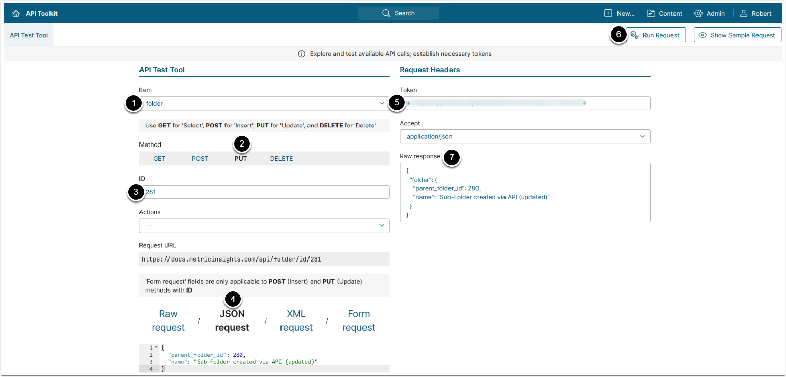 - Select JSON request and enter JSON with the updated Folder's data:- See Example Response for details on Folder's data