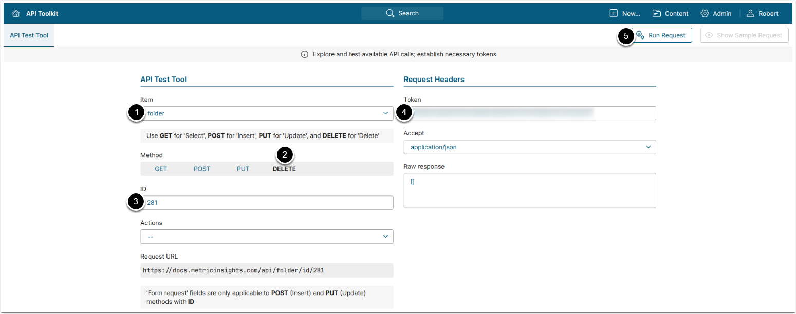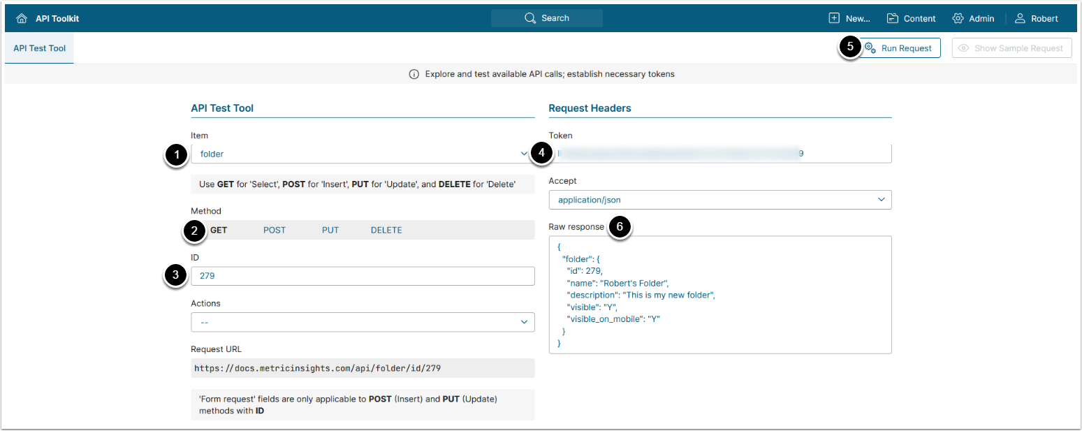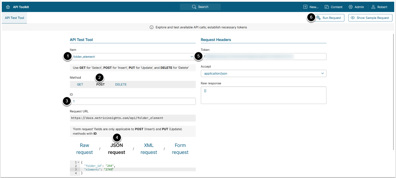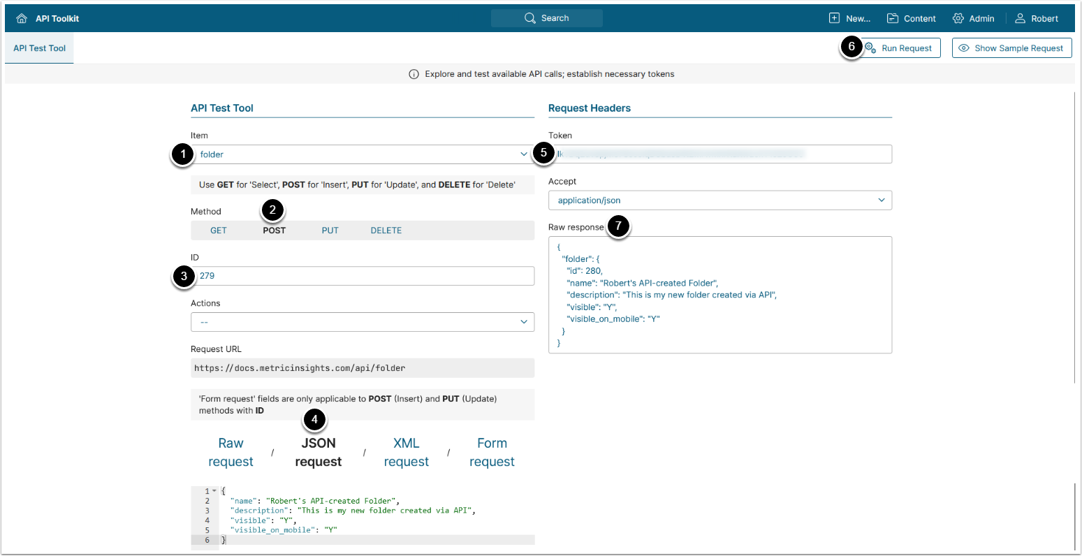 - Select JSON request and enter JSON with the updated Folder's data:- See Example Response for details on Folder's data