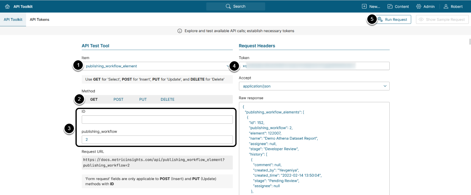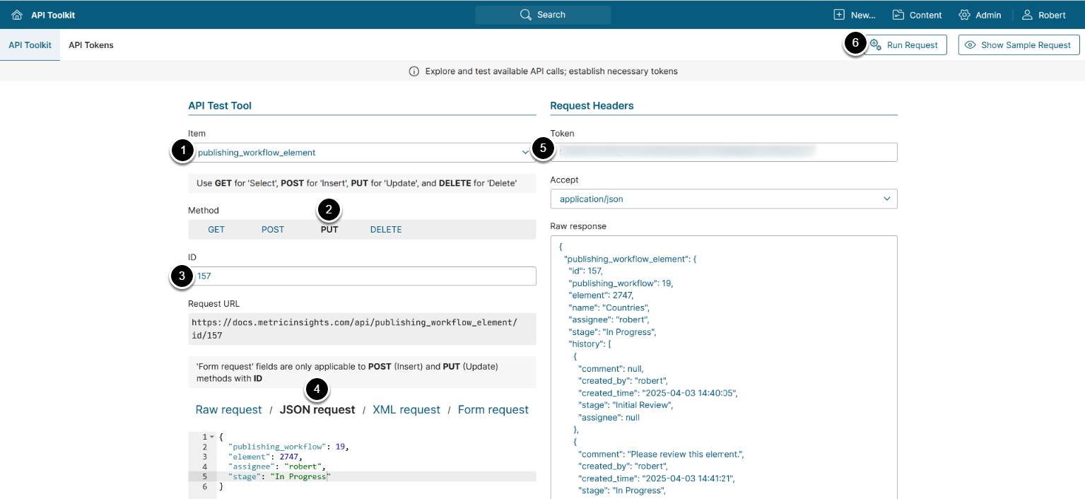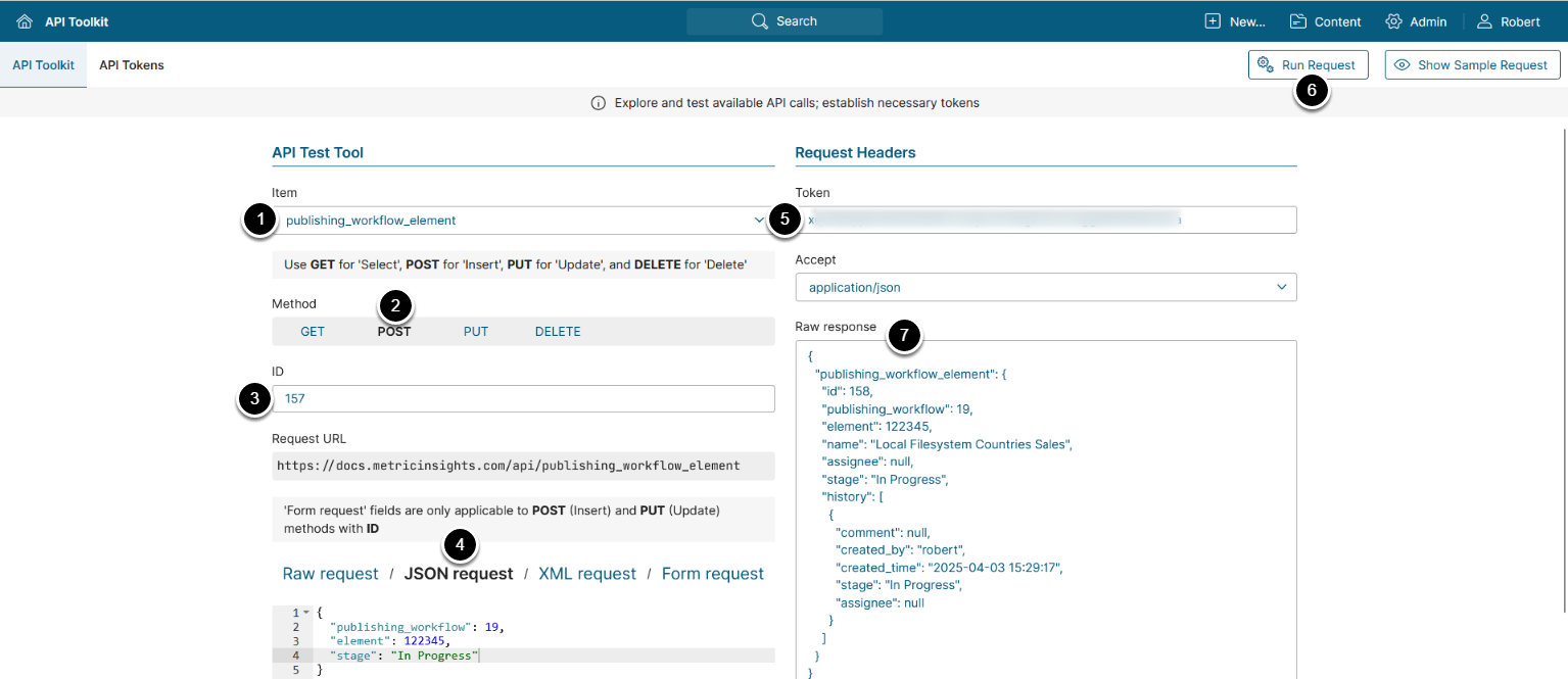 - The updated publishing_workflow_elementdata entry is displayed in the Raw response field- See Example Response and Fields Description for details