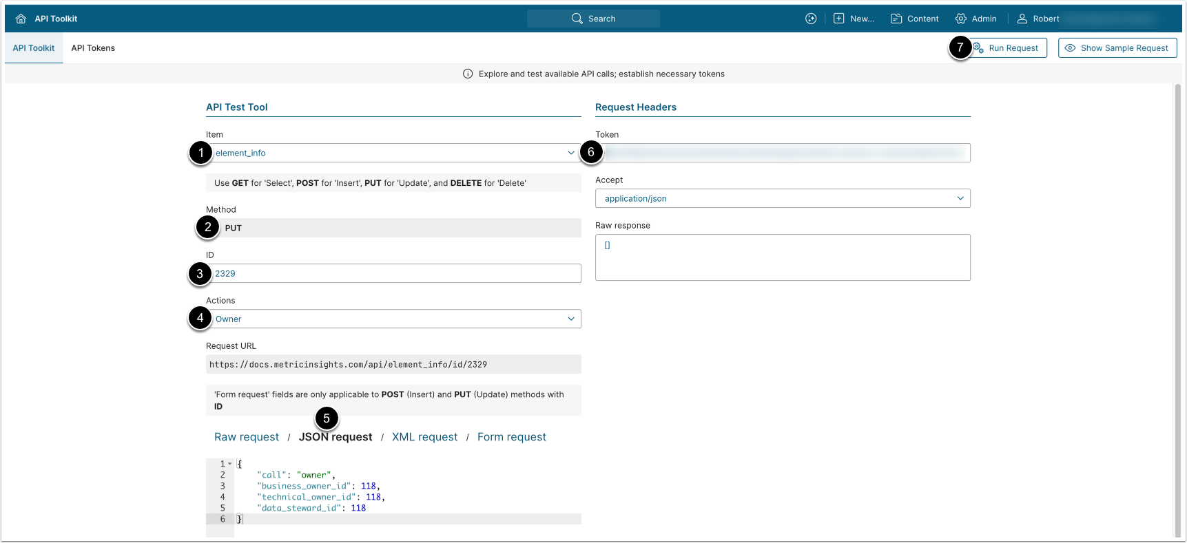 - Select JSON request and replace request with the following JSON providing the needed values.- Optional parameters: business_owner_id,technical_owner_id,data_steward_id: