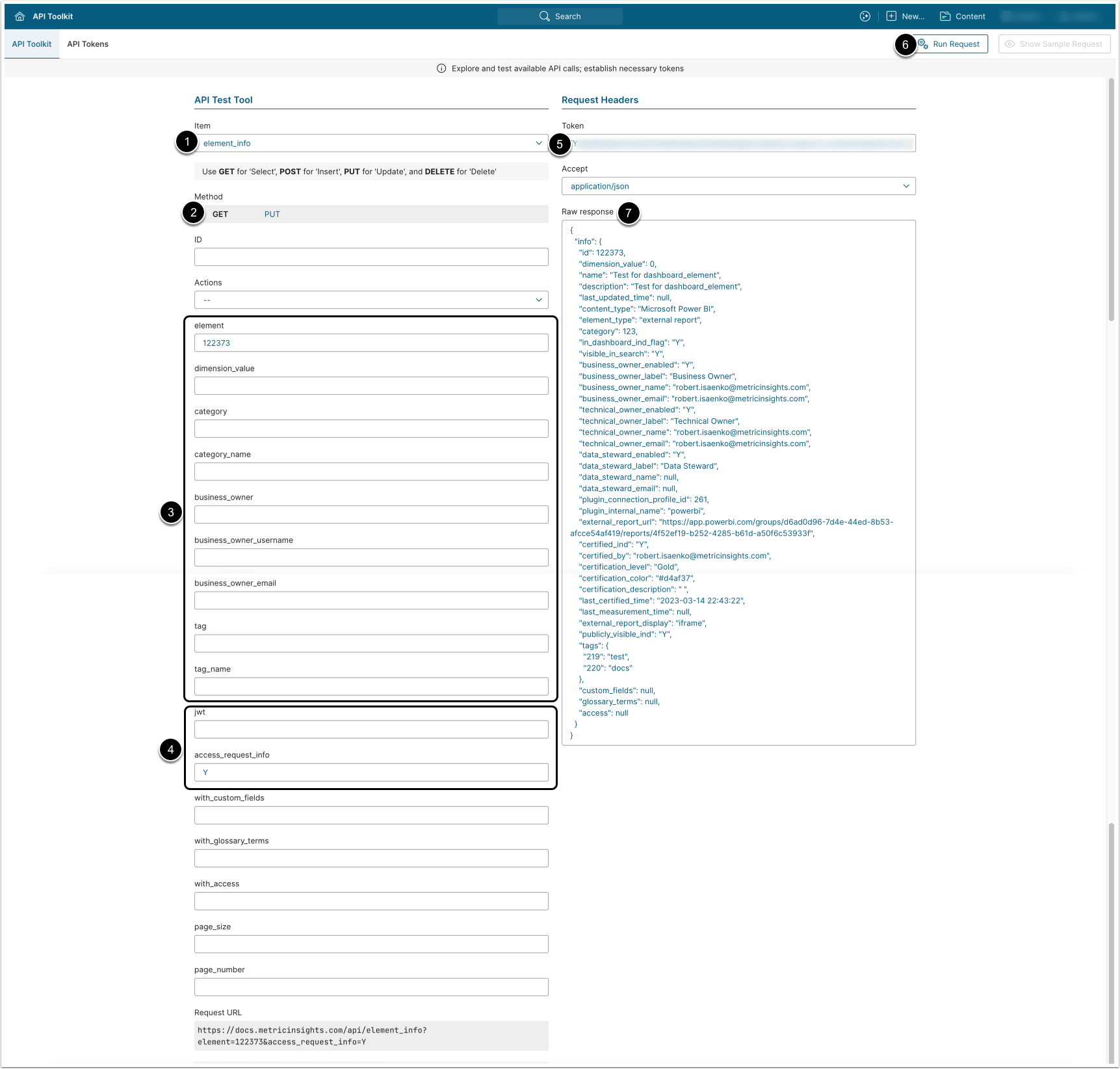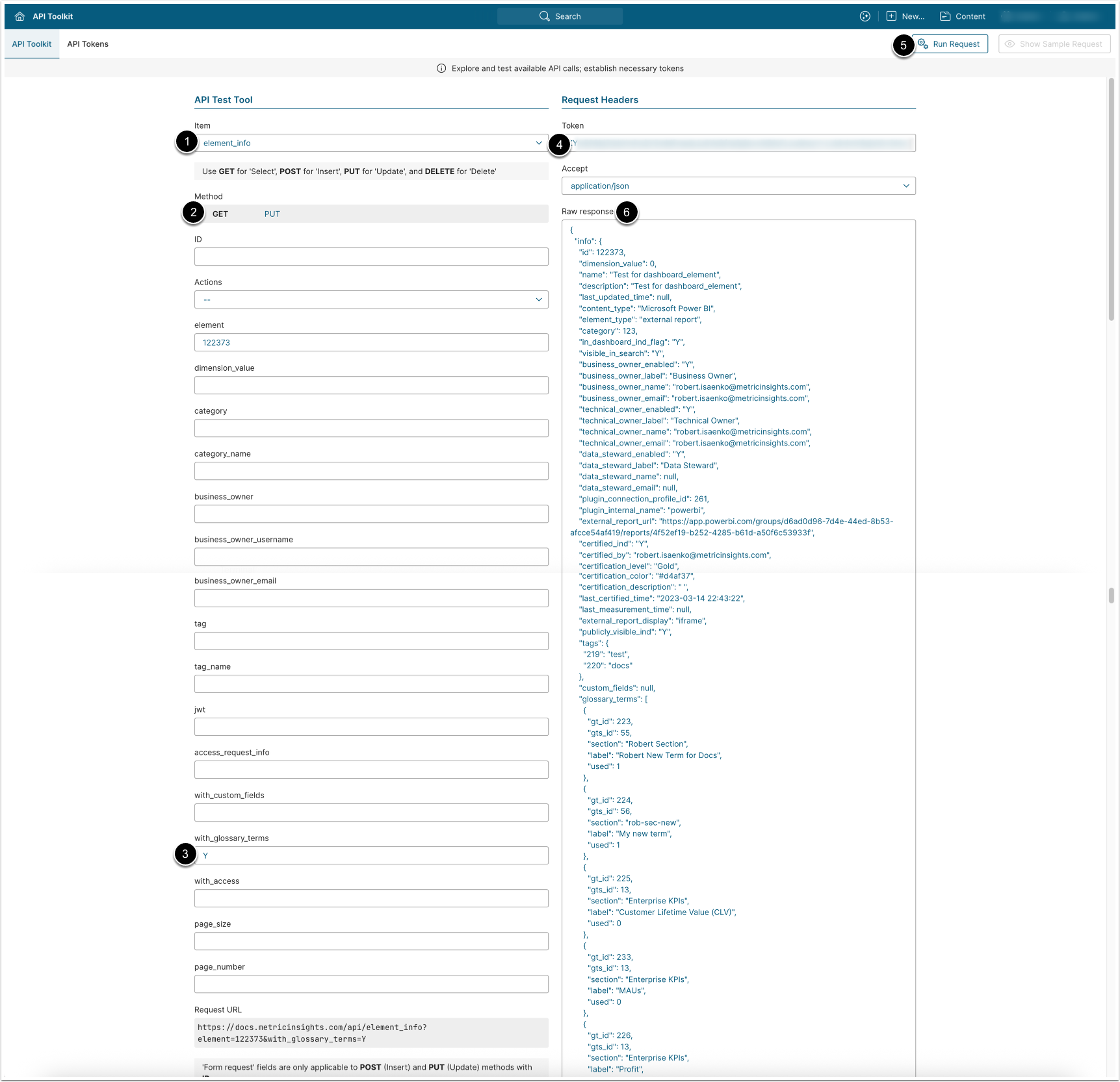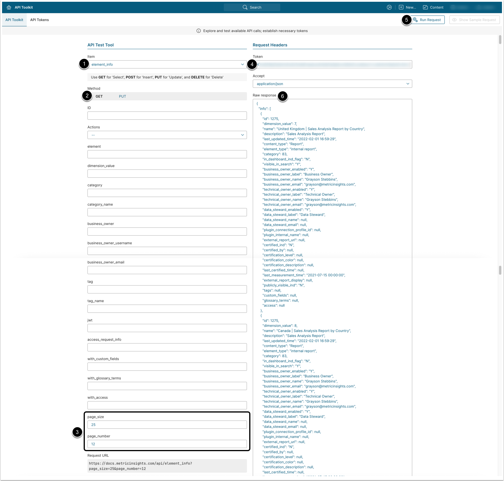 - /api/element: Returns all Elements available to a user, including options to include hidden items, Folder associations, Tags, and Glossary Terms.