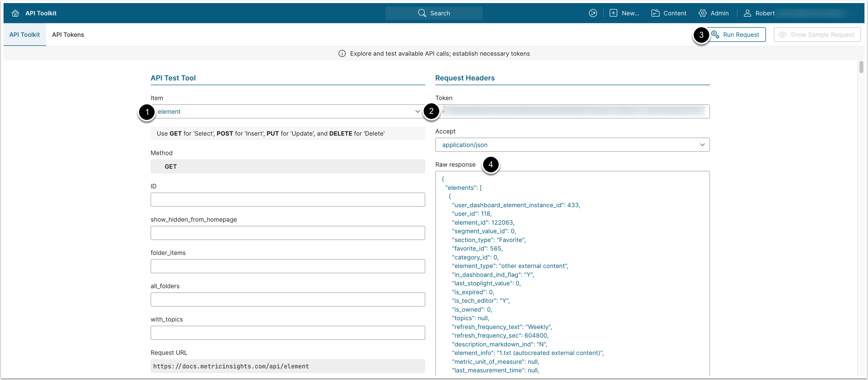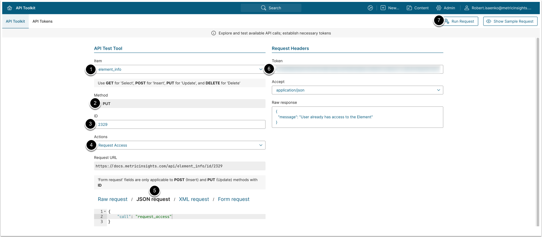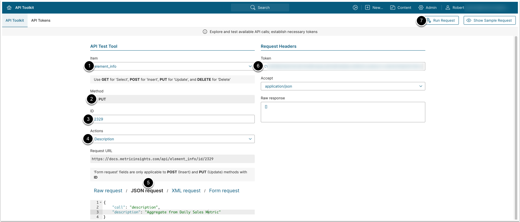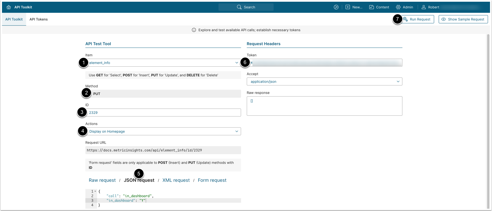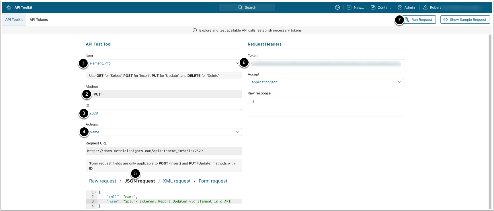 - Select JSON request and replace request with the following JSON providing the needed values.- Optionally, use the description_markdown_indparameter to specify whether to apply Markdown to the element's description:
