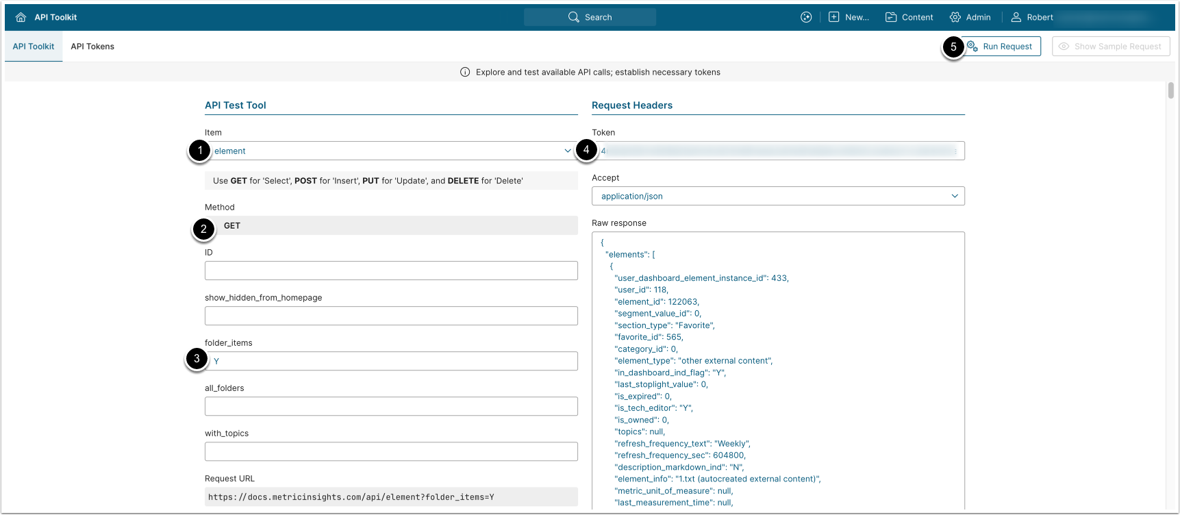 - The returned object contains an array of objects representing all elements available to the user who executes the API call.- See Example Response and Fields Description for details