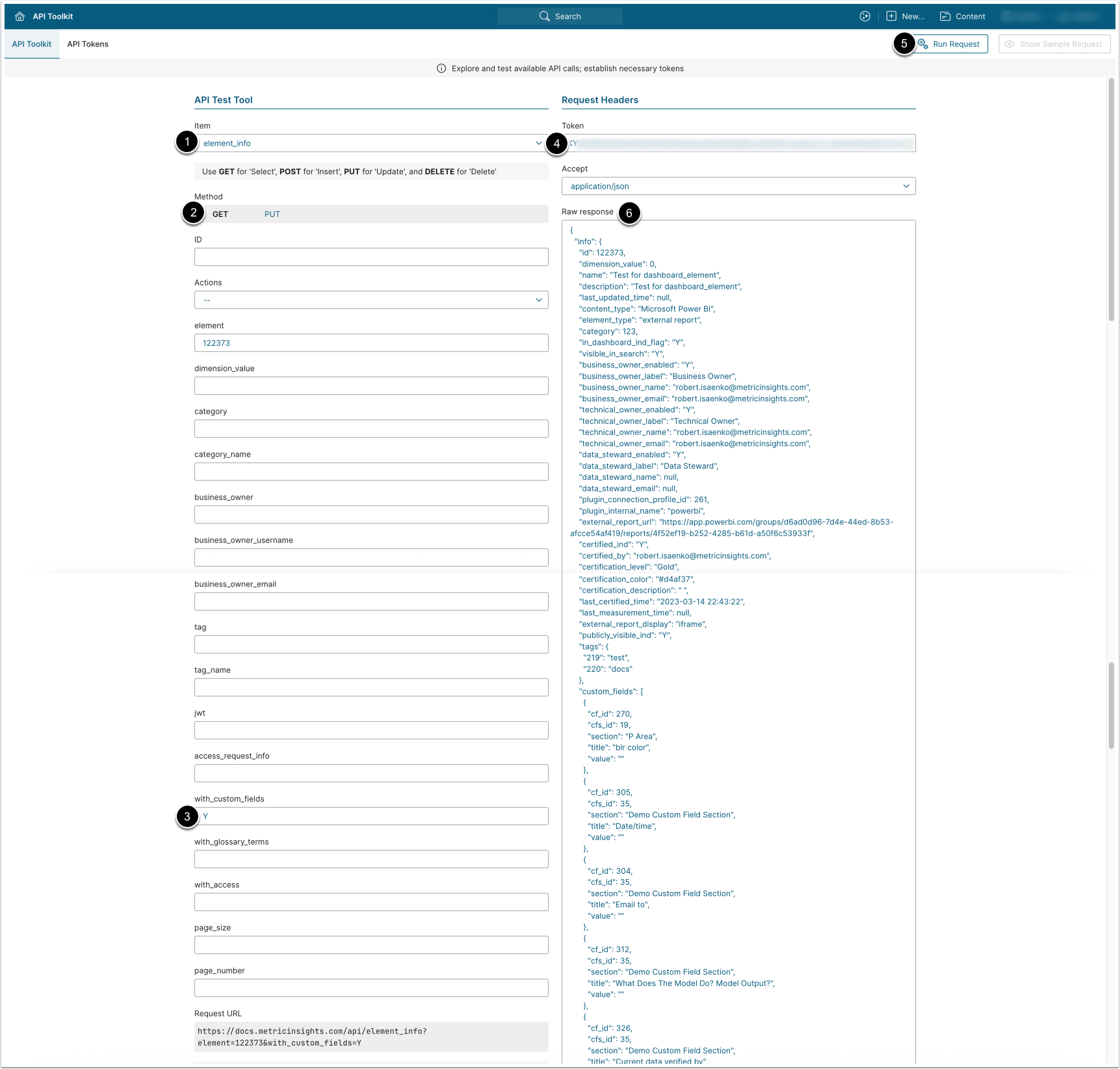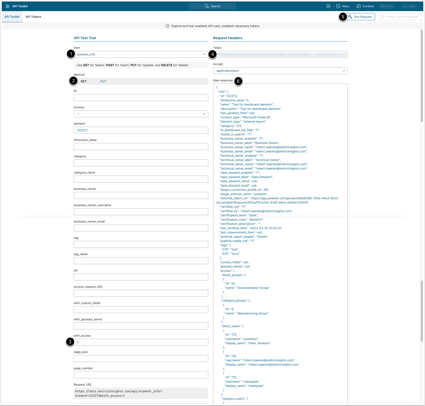 - /api/element_info: Provides detailed information for all or selected Elements, with support for filtering by Category, Owner, Tag, or Dimension values.- PUT requests to /api/element_info: Allow updates to Element properties such as Name, Description, Certification, Dashboard visibility, Ownership, and Discoverability, as well as adding Elements to Publishing Workflows or requesting access.
