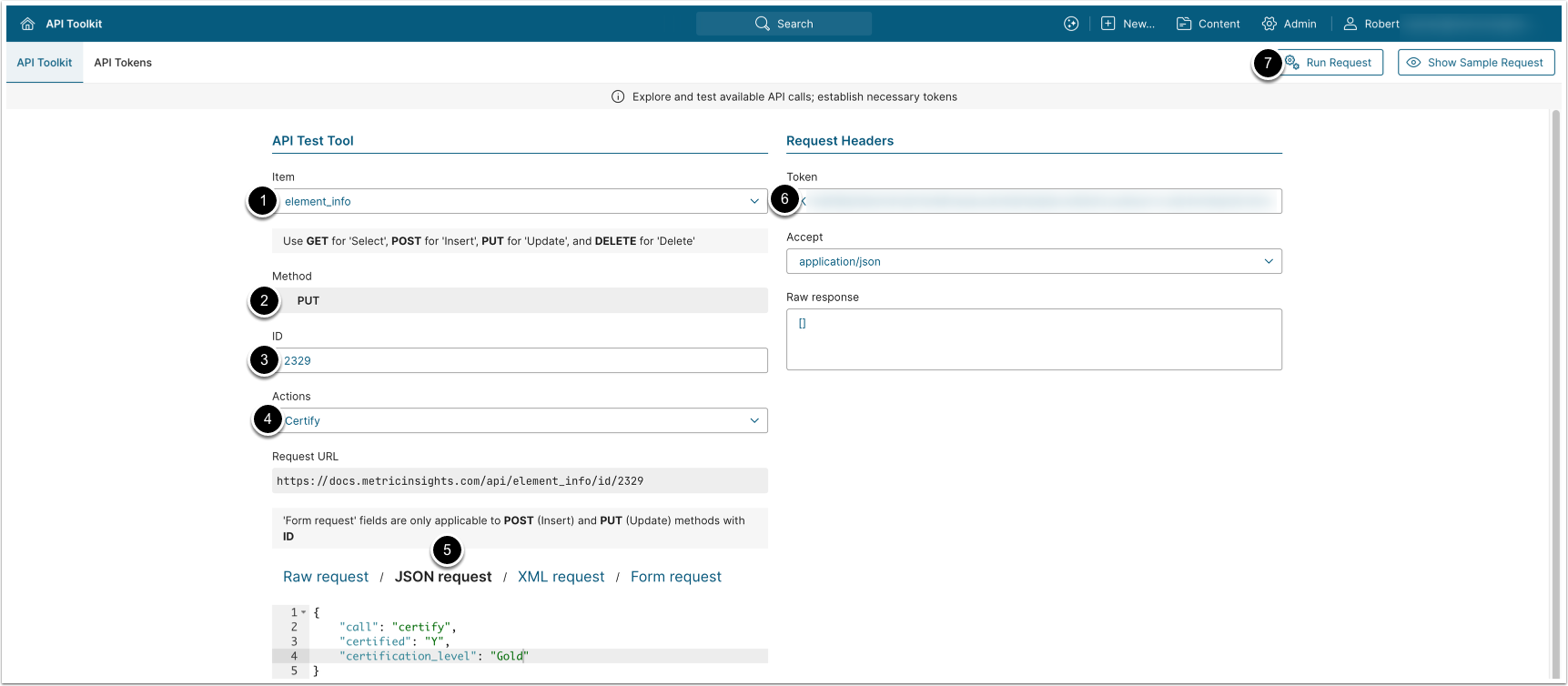 - Select JSON request and replace request with the following JSON providing the needed values.- For MI v7.1.1+: Optionally, use the certification_level_indparameter to specify the element's certification level: