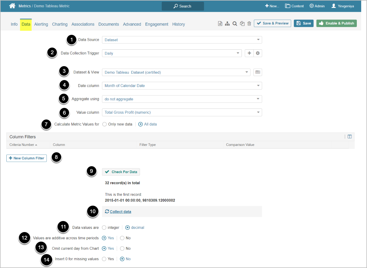 - Define either to Calculate Metric Values for new instances only (the system won’t recalculate data in old instances) or for all data
