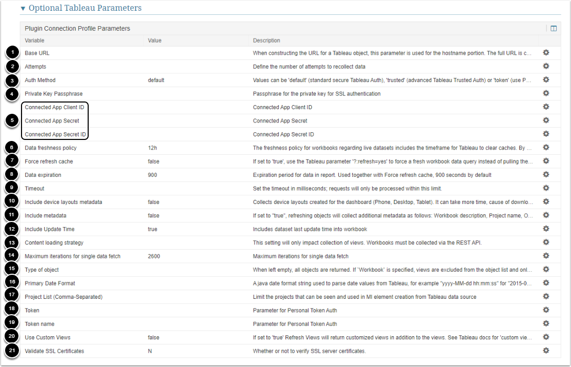 When you create a Tableau Data Source, along with other settings, you need to define mandatory and optional Tableau parameters.
