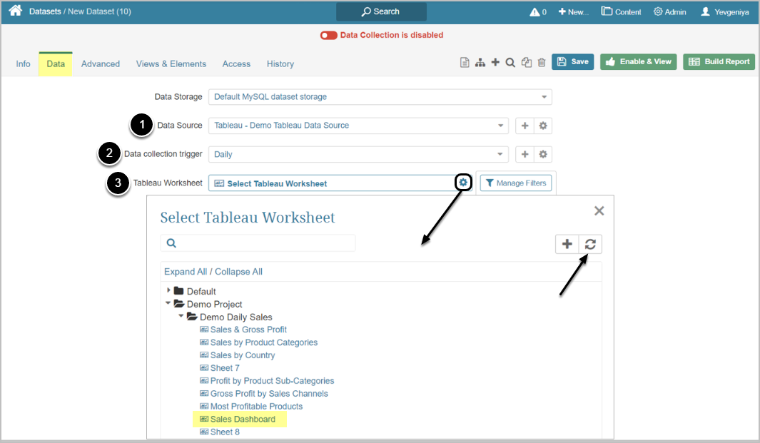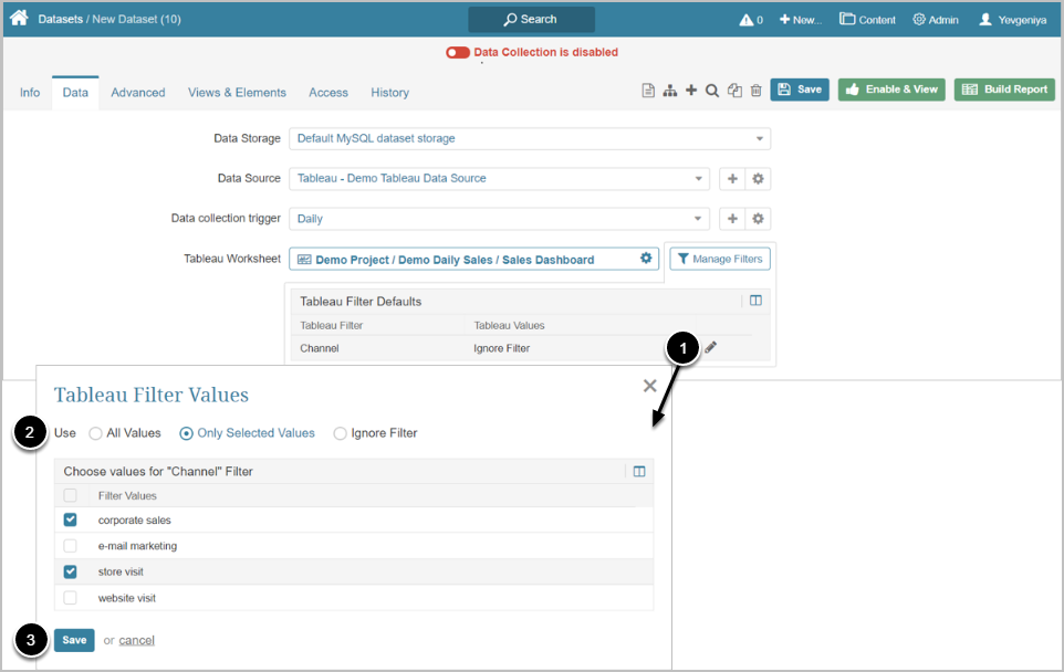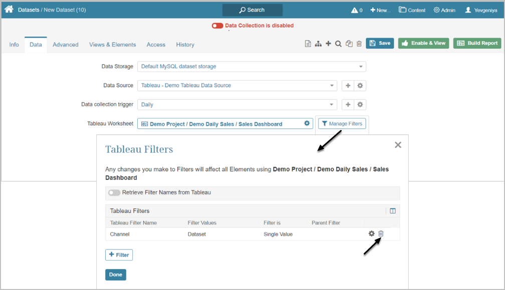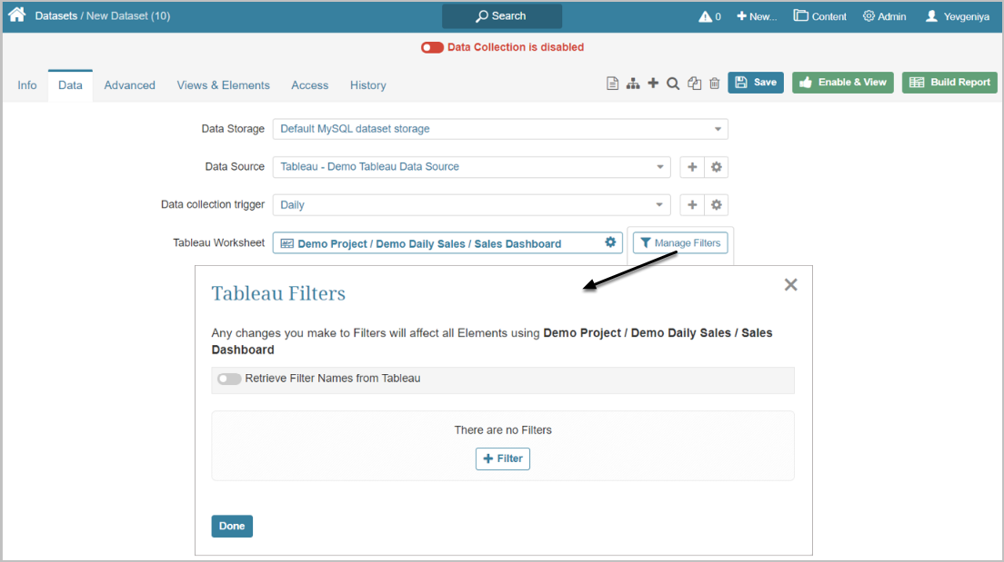 When creating a Metric/Dataset/External Report from Tableau, after you define the Worksheet that should serve as a Data Source, you may pre-filter information that is going to be fetched.